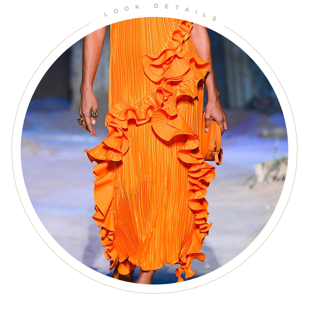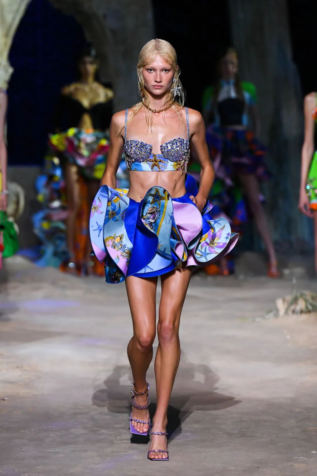 Donatella打造出的时尚国度让所有人惊叹于Versace的魅力。沉迷在洋底幻境之中,观赏所有的华服,产生的致幻感让人挣脱束缚,释放最真实的自我。礼服上巧妙的裙褶犹如潮水涌动,将视线引向海平面,这里是一切故事的起点。