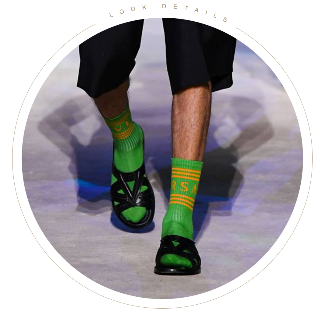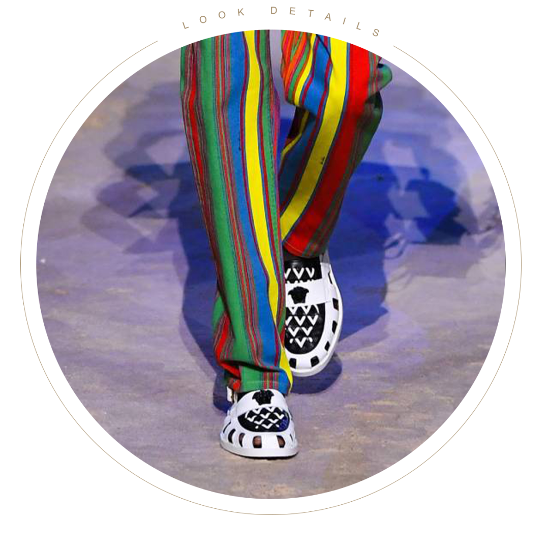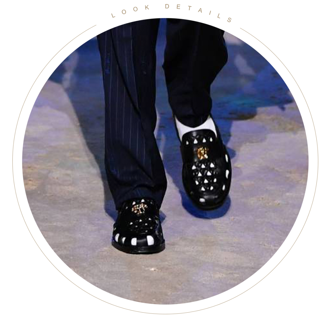 男装鞋履则更是大胆颠覆,极具奢华的运动风格。镶嵌Versace金色人像的皮鞋鞋面及边缘都加入了几何镂空,汲取了古希腊神话的文明历史,趣味线性交织的拖鞋大抒狂野之美,将深旷海底的诱惑、活力、幻想完美融合。