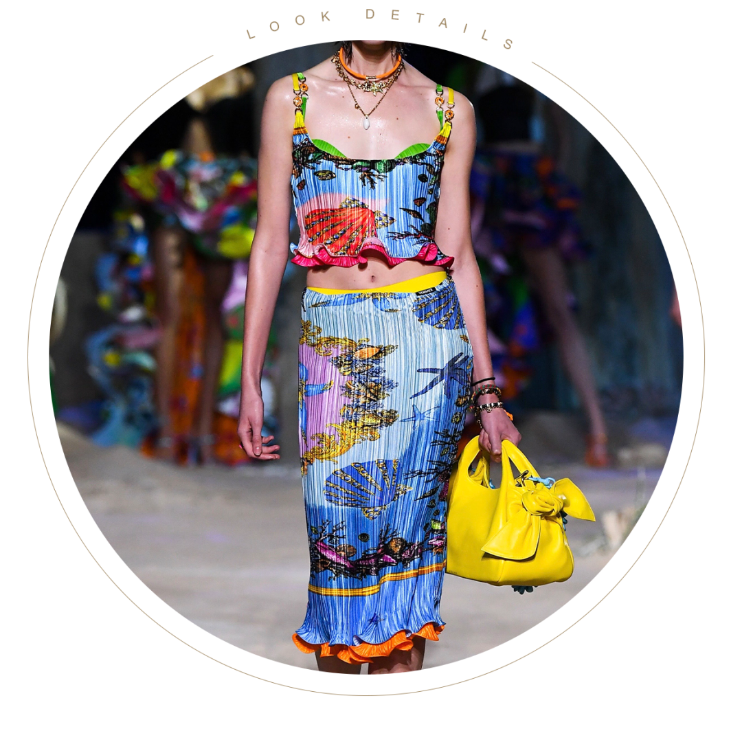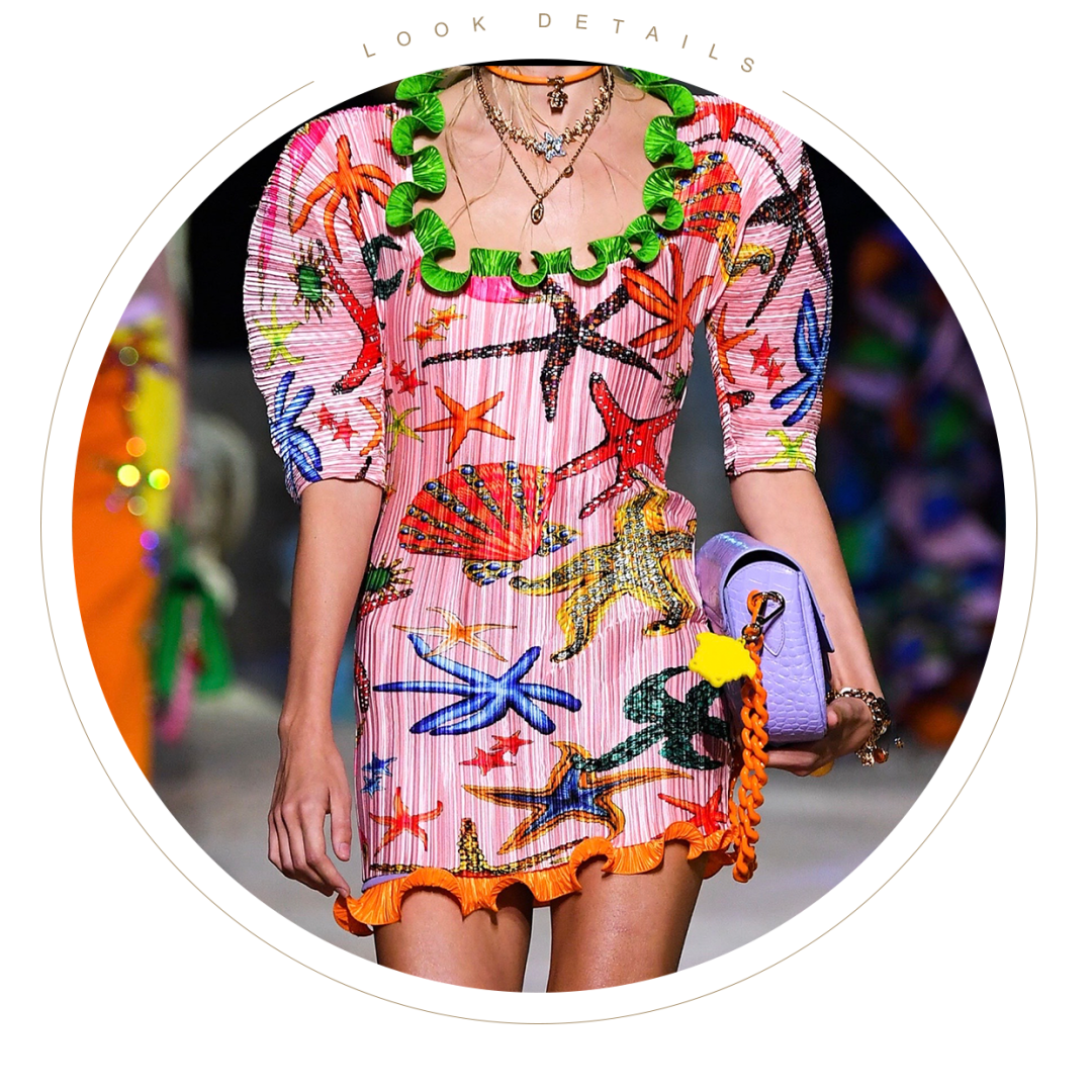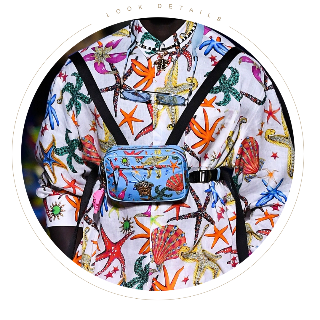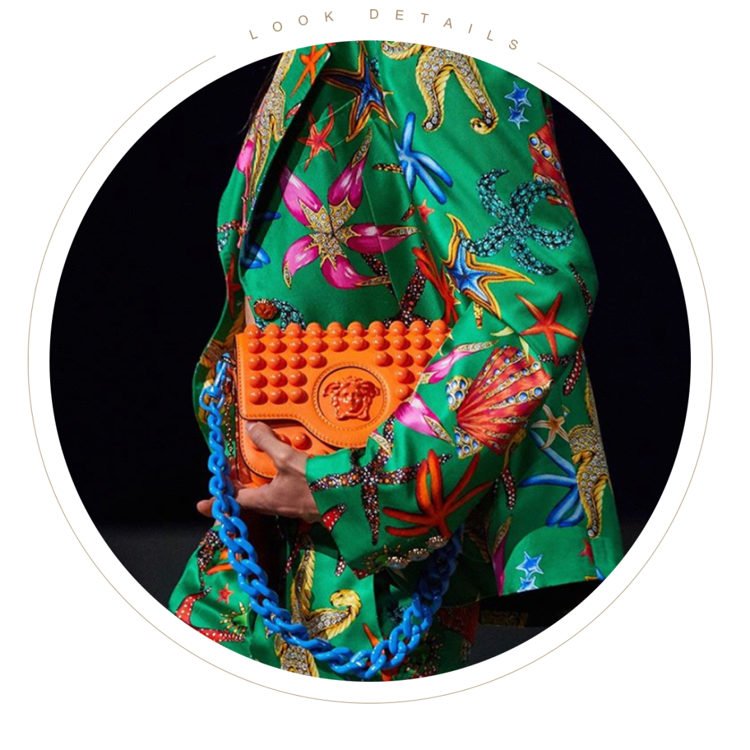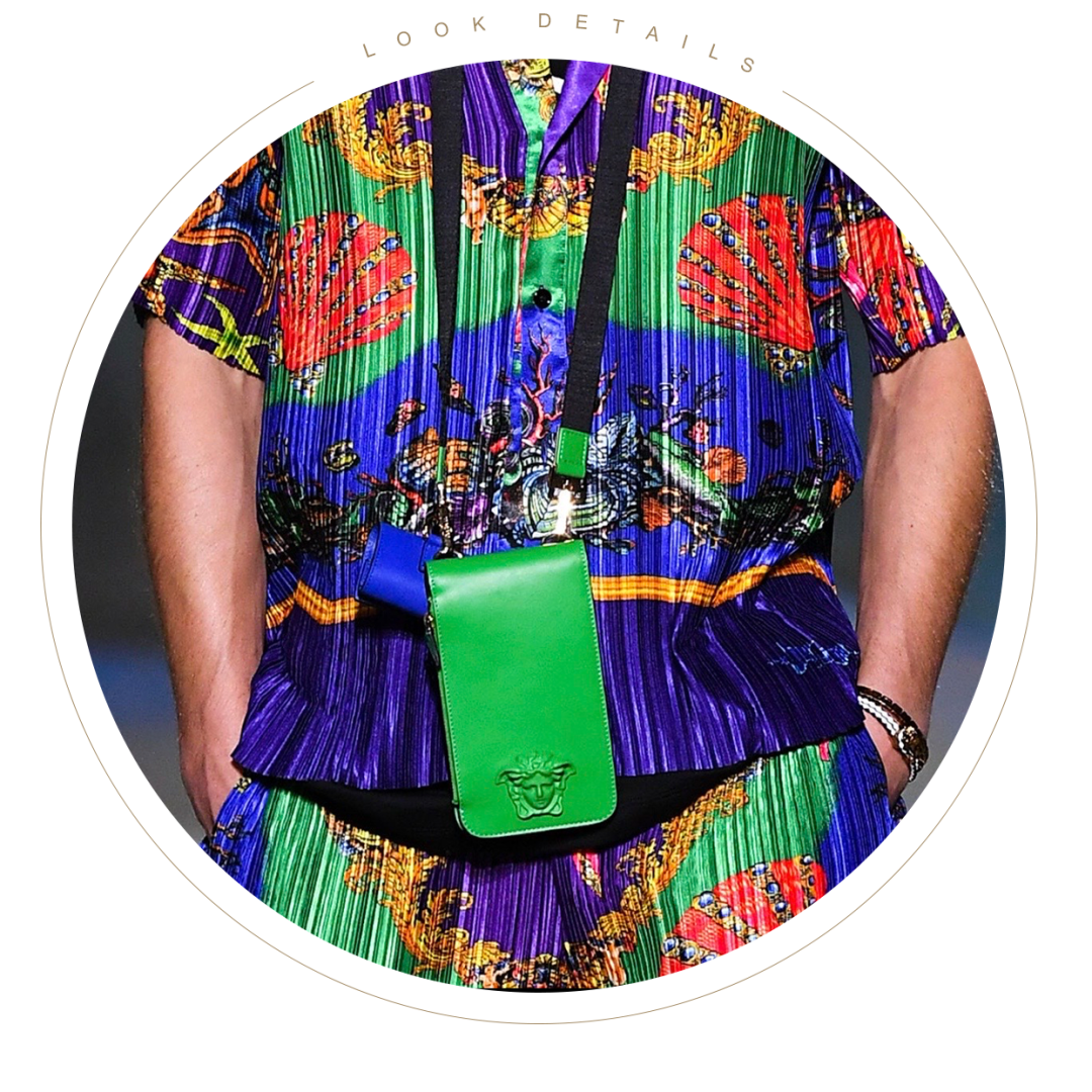 以品牌标志性Trésor de la Mer印花描绘的海洋生物,在男女装上以鲜明的色调重新焕发活力,该印花设计是对法国文艺复兴时代艺术的时尚演绎,也是Gianni Versace的关键设计特色之一。结合着泡泡纱细节突显了品牌的精湛工艺,在复杂的百褶面料中,Trésor印花被放大仍能完美呈现图案。