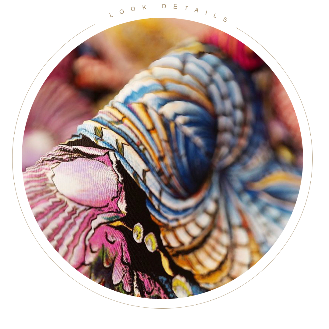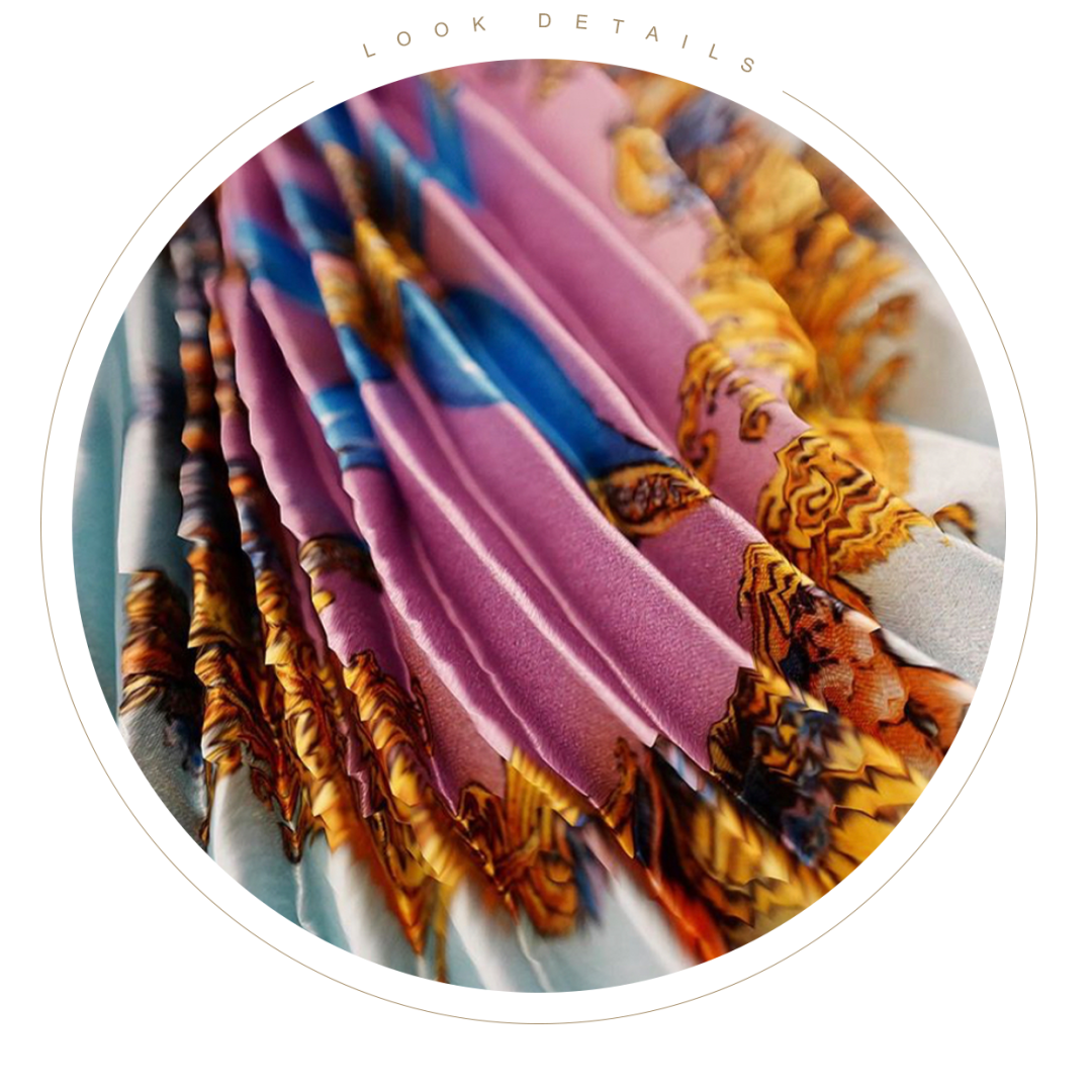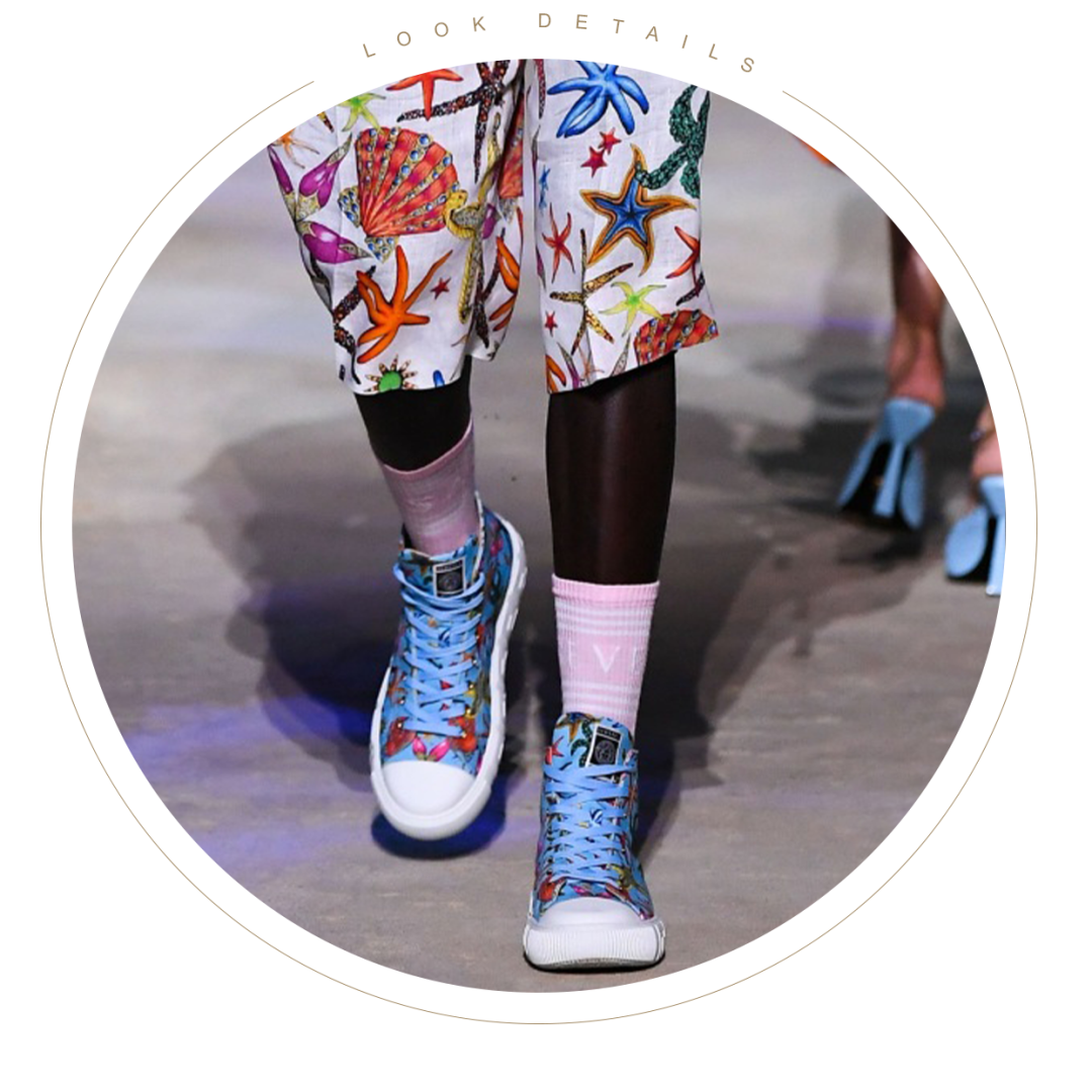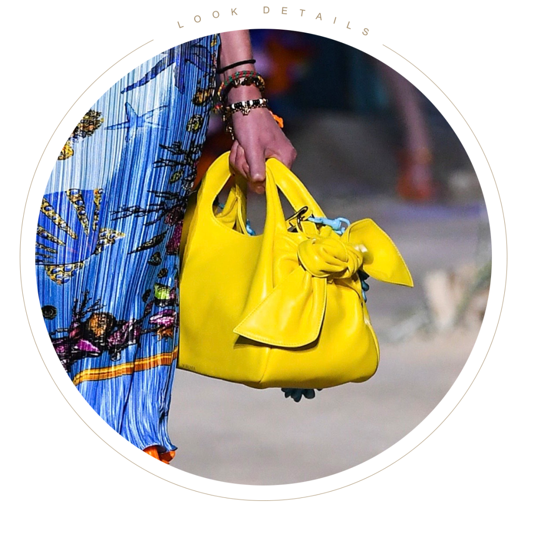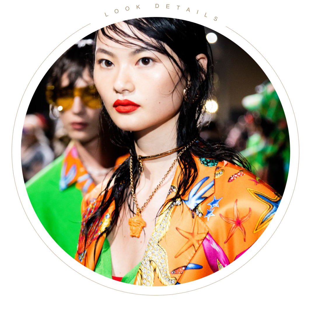 以品牌标志性Trésor de la Mer印花描绘的海洋生物,在男女装上以鲜明的色调重新焕发活力,该印花设计是对法国文艺复兴时代艺术的时尚演绎,也是Gianni Versace的关键设计特色之一。结合着泡泡纱细节突显了品牌的精湛工艺,在复杂的百褶面料中,Trésor印花被放大仍能完美呈现图案。