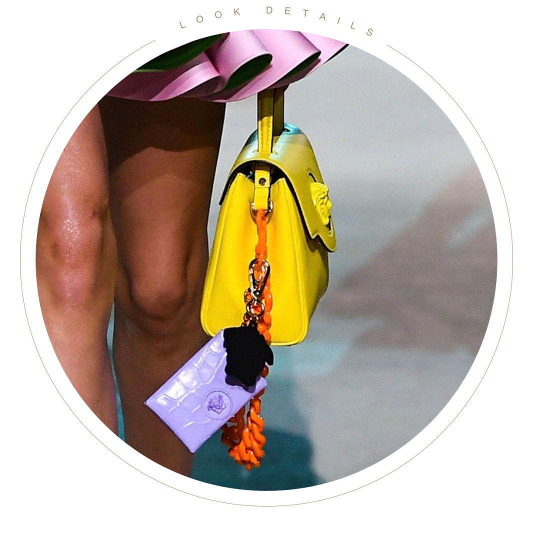 包袋上的撞色链条有着极强的张力,展现了神秘而原始的美学原理。而子母包设计则体现了Versace对现实中实用性的观照,充满了生活乐趣。