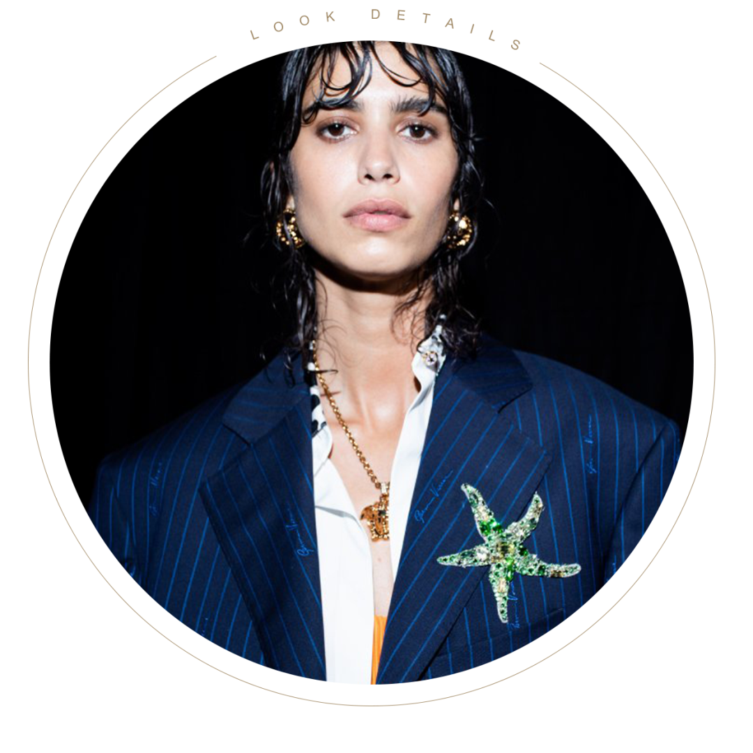 此次Versace 2021春夏大秀的海洋主题也贯穿了配饰方面,创意总监Donatella Versace 将Gianni Versace在1992年春夏系列使用过的海星、珊瑚和贝壳元素重新诠释,Versace的人像logo也在此季系列中被继续沿用,高调铺陈在了胸针、耳饰、项链上,重现了Versace上世纪90年代的辉煌,如同潜水镜般的墨镜带领我们探索神秘的海底乌托邦。