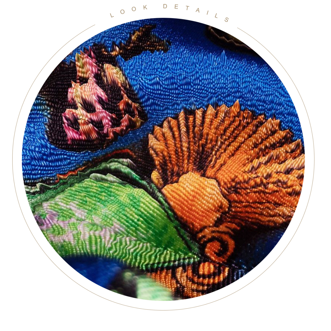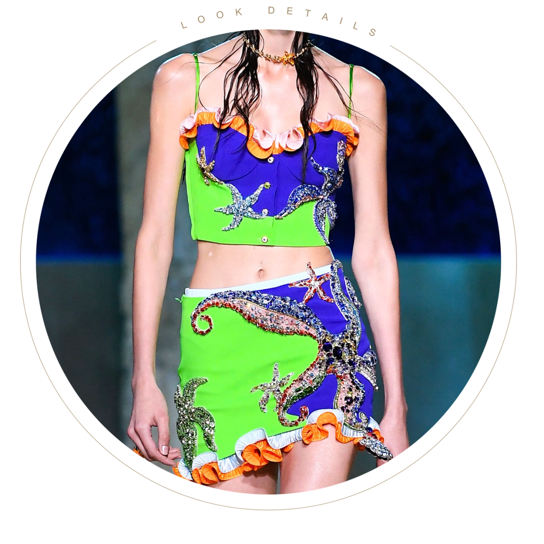 往下深入,海洋中的万物尽现,Versace将它们描摹下来,刻进服装的灵魂之中。鲜明的色调充满魔力,栩栩如生的印花焕发着生机。