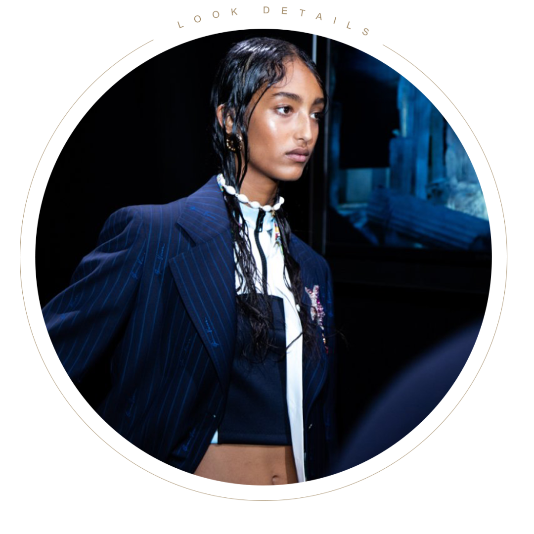 适用于日常穿着的经典条纹西装作为第一套Look开场,20世纪80~90年代时髦又复古的廓形和剪裁是Donatella Versace一贯的拿手好戏,硬挺酷感的立体结构无处不在地体现Versace简化、自信的性感。