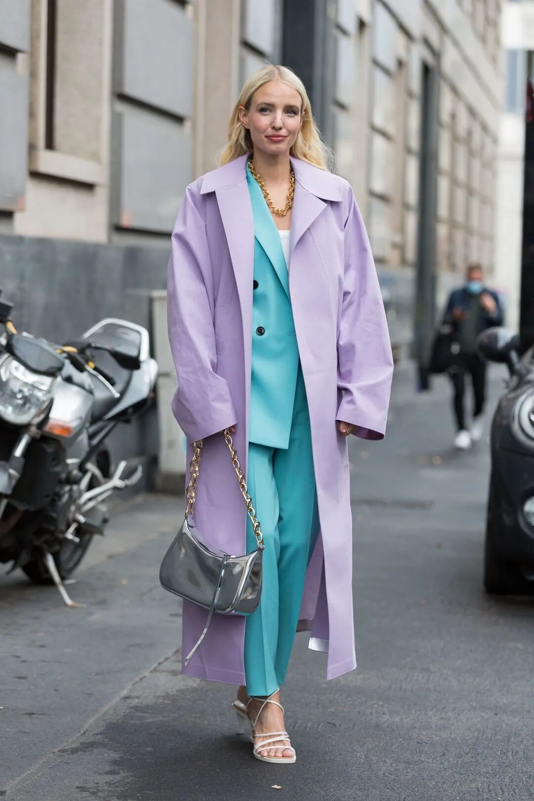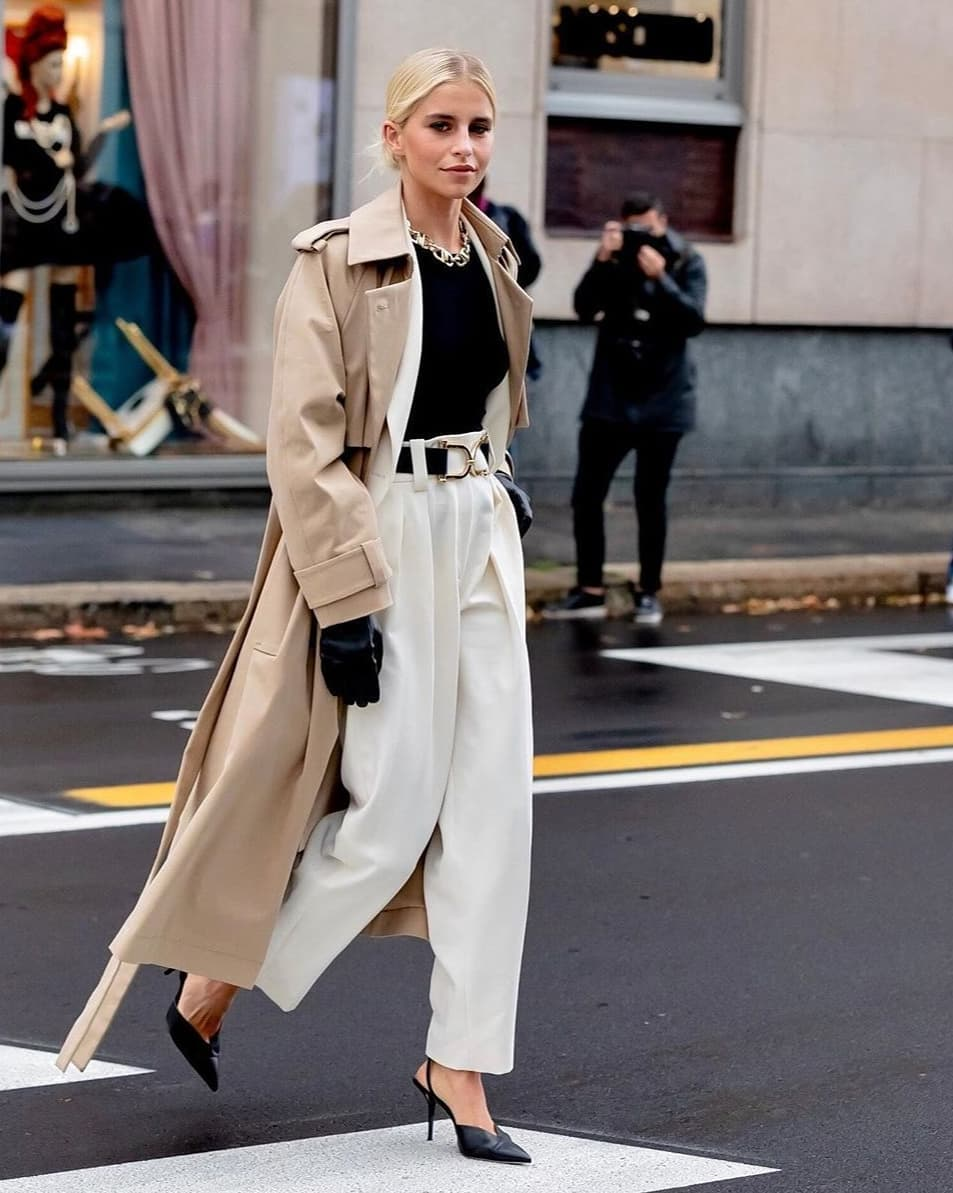 如果你是职场女孩,还可以参考博主Caroline Daur的搭配——在西服套装外加上一件风衣,即能随时保持时髦,满足室内室外不同场景的需要。