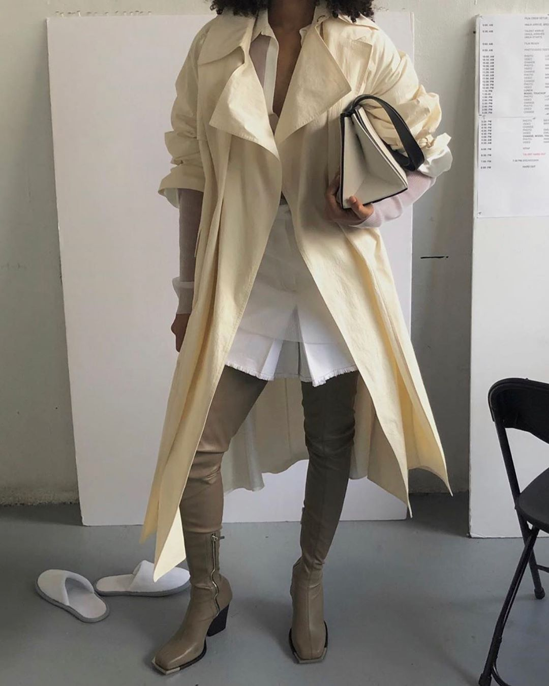 另一款奶白色的风衣也很气派,更能看出服装本身利落而大气的廓形,可以和模特一样,配上同为中性色的长筒靴和白衬衣,干练清爽。