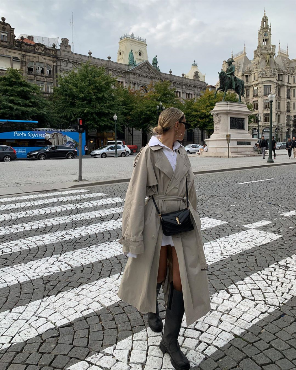 Sofia则是用长靴和衬衣制造出下衣失踪效果,再套上一件长风衣,完美展现又酷又飒的chic形象。