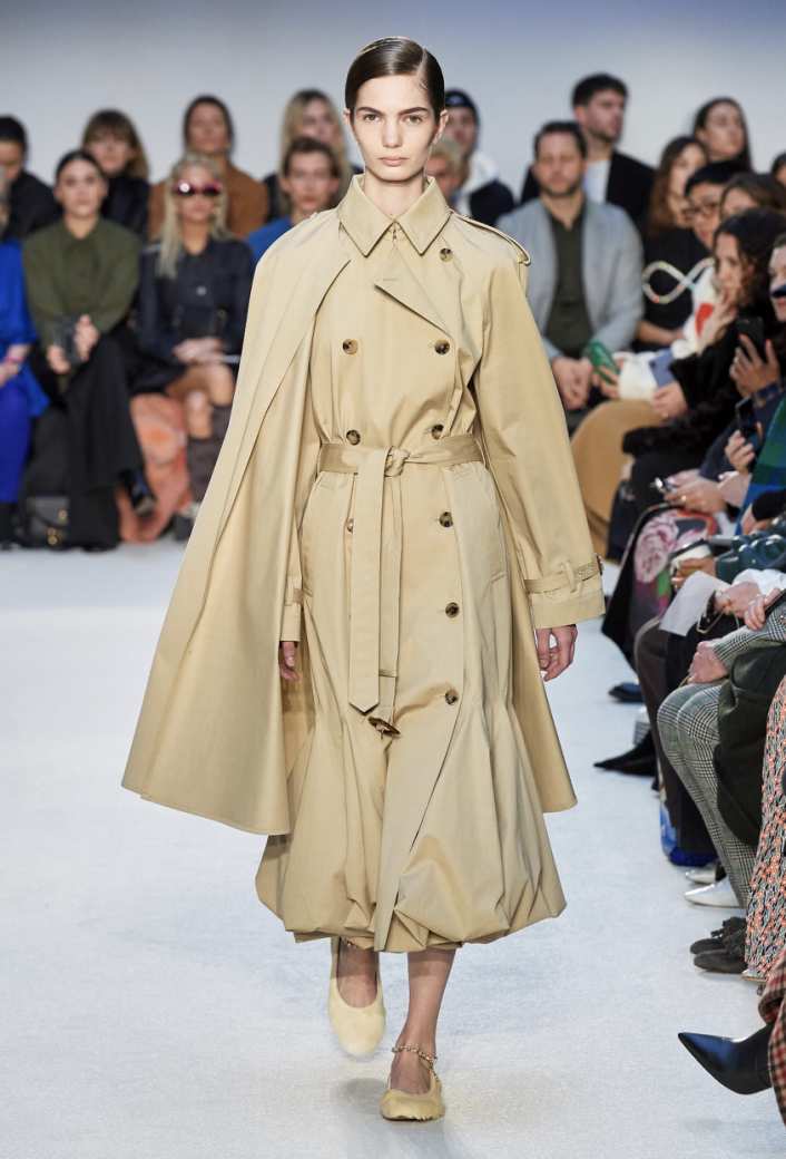除此之外,伞形轮廓风衣也很绝,微喇的下摆颇有简洁而流畅的流线型美感,无论是敞开还是系上腰带都很有气质,而善于用同色系进行搭配的Lemaire也继续将这一Dress Code演绎到完美。