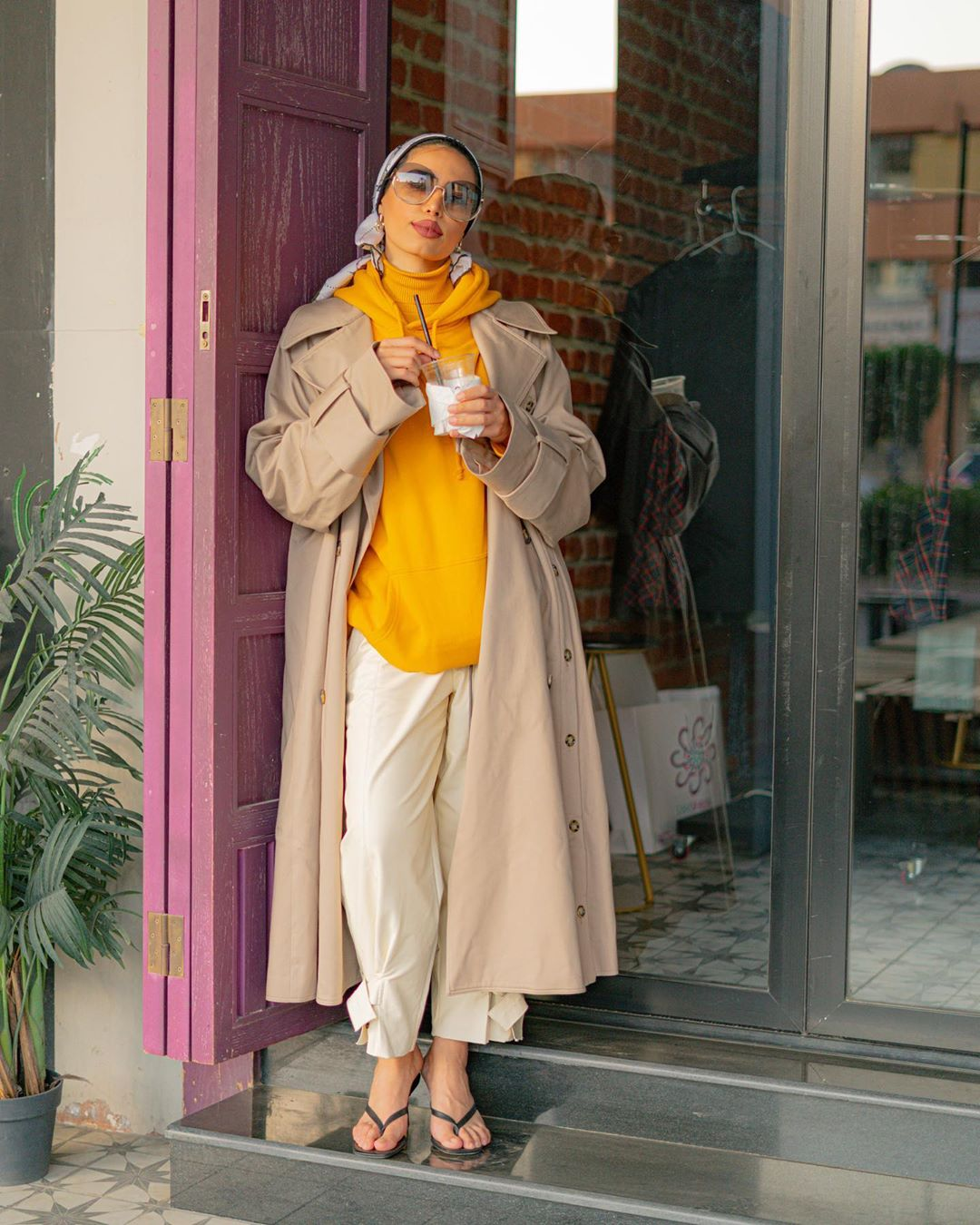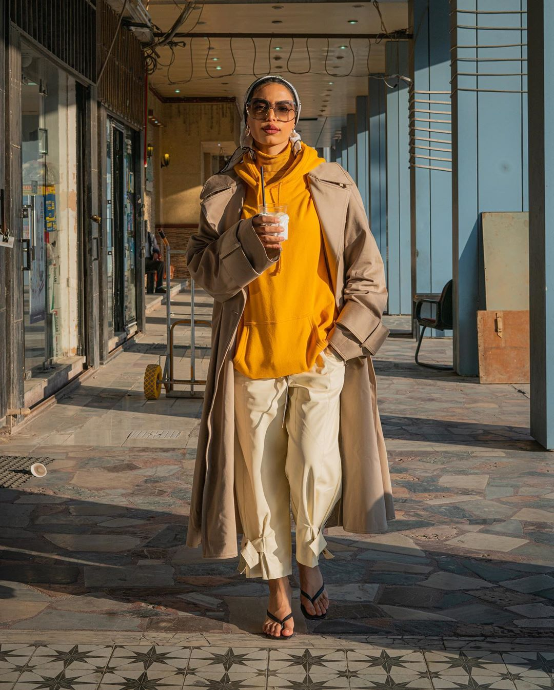 除此之外,运动风也在Oversiezd风衣的阻击范围之内,博主Fatema就很有sense,别出心裁地用连帽卫衣和风衣混搭出街头休闲感。