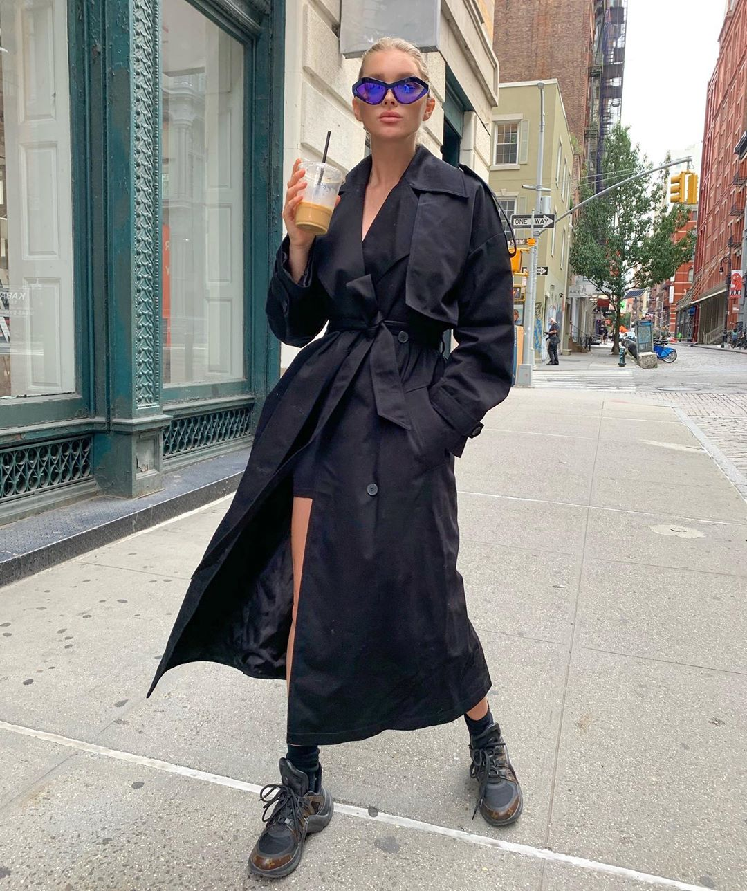 超模Elsa Hosk最近就上身了一件超大Size的黑风衣,对于她来说刚刚好,和骑行裤以及Sneaker相搭,穿出很强的个人风格,全身All Black简直是酷到没朋友!