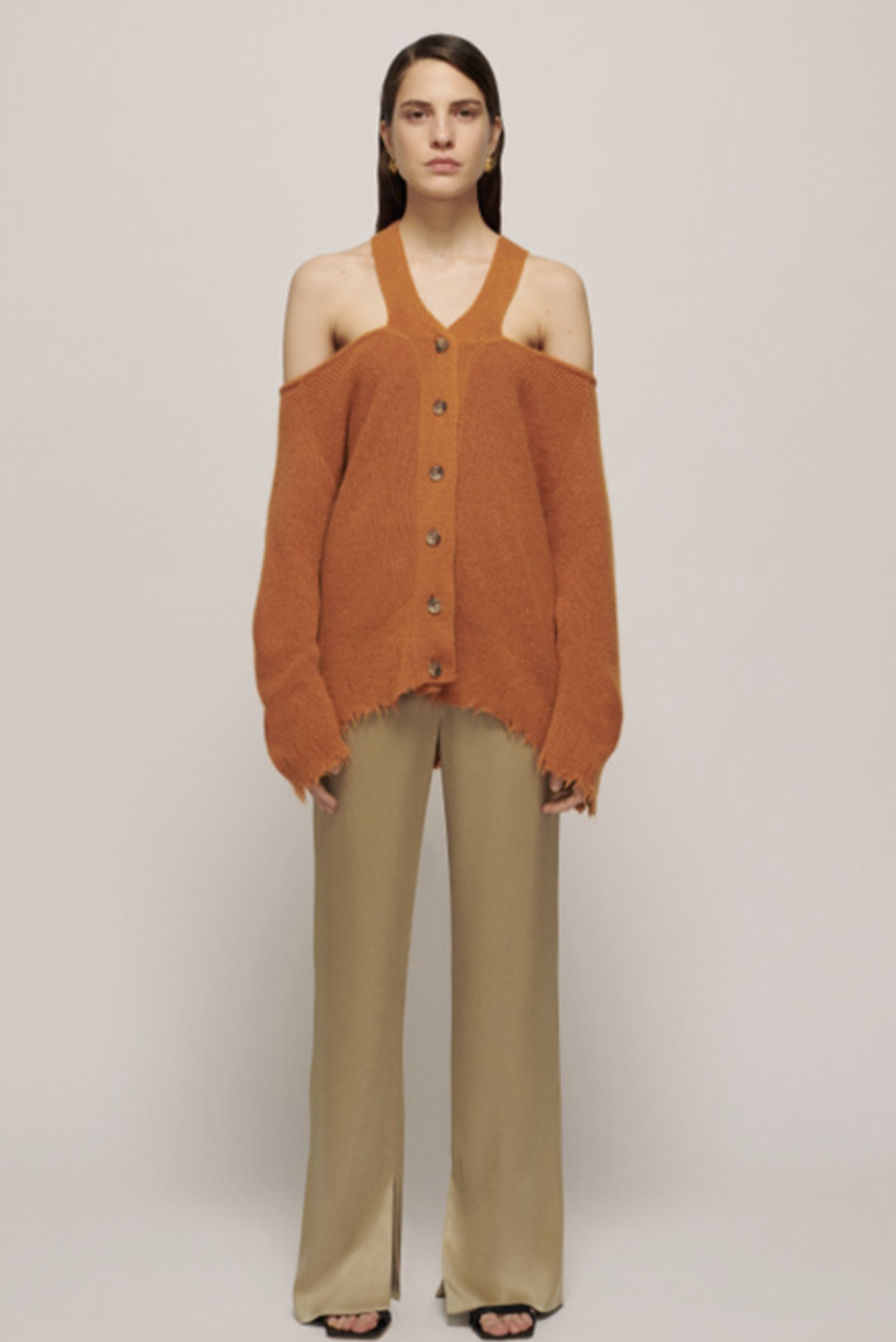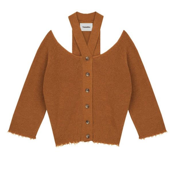 如果小切口的挖肩还不够过瘾,更大胆的在这儿呢!Nanushka的这款大挖肩毛衣开衫就是辣妹们的不二之选。将毛衣在肩颈部裁开,形成一字肩袖口和挂脖的巧妙设计,谁说秋冬穿毛衣不能性感火辣了?随便搭上一条纯色长裤加上一双长靴就可以去炸街了!