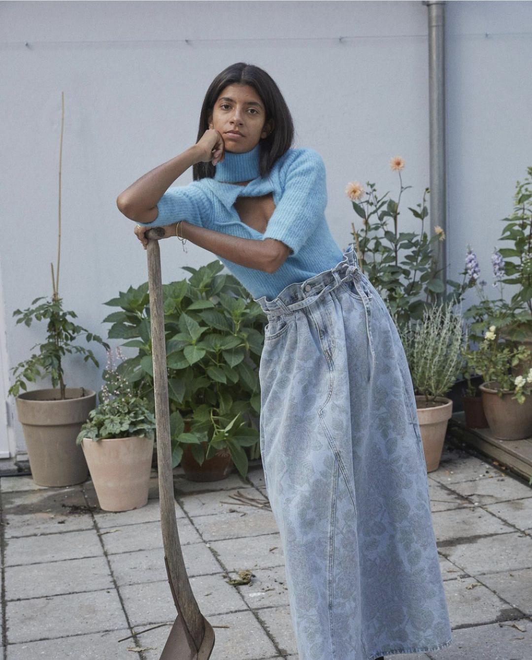 Ganni另一款挖空毛衣也是可圈可点,仔细观察,可爱的纽结设计分开了领子和胸口,形成了双挖空设计,天蓝色用在秋天穿的毛衣上给人一种温暖明媚的感觉,不论是内搭或单穿都十分吸睛!