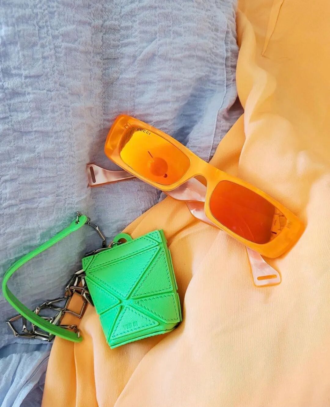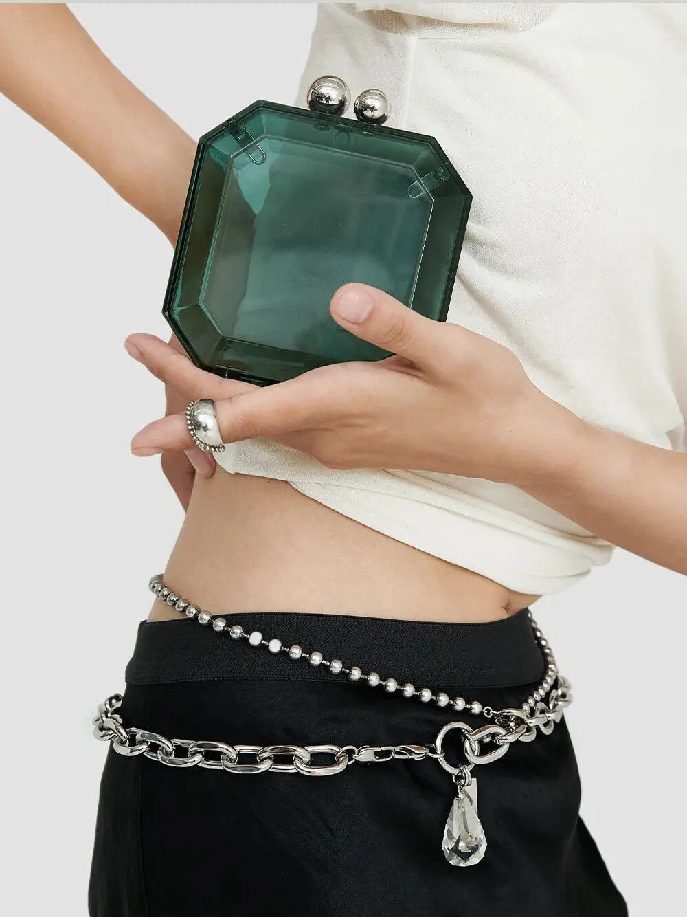 这种造型独特的还有小众品牌THEKYNOW,宝石造型的emerraid mini bag,在不同色彩、材质与链条的搭配下,绝对是新潮至极!
