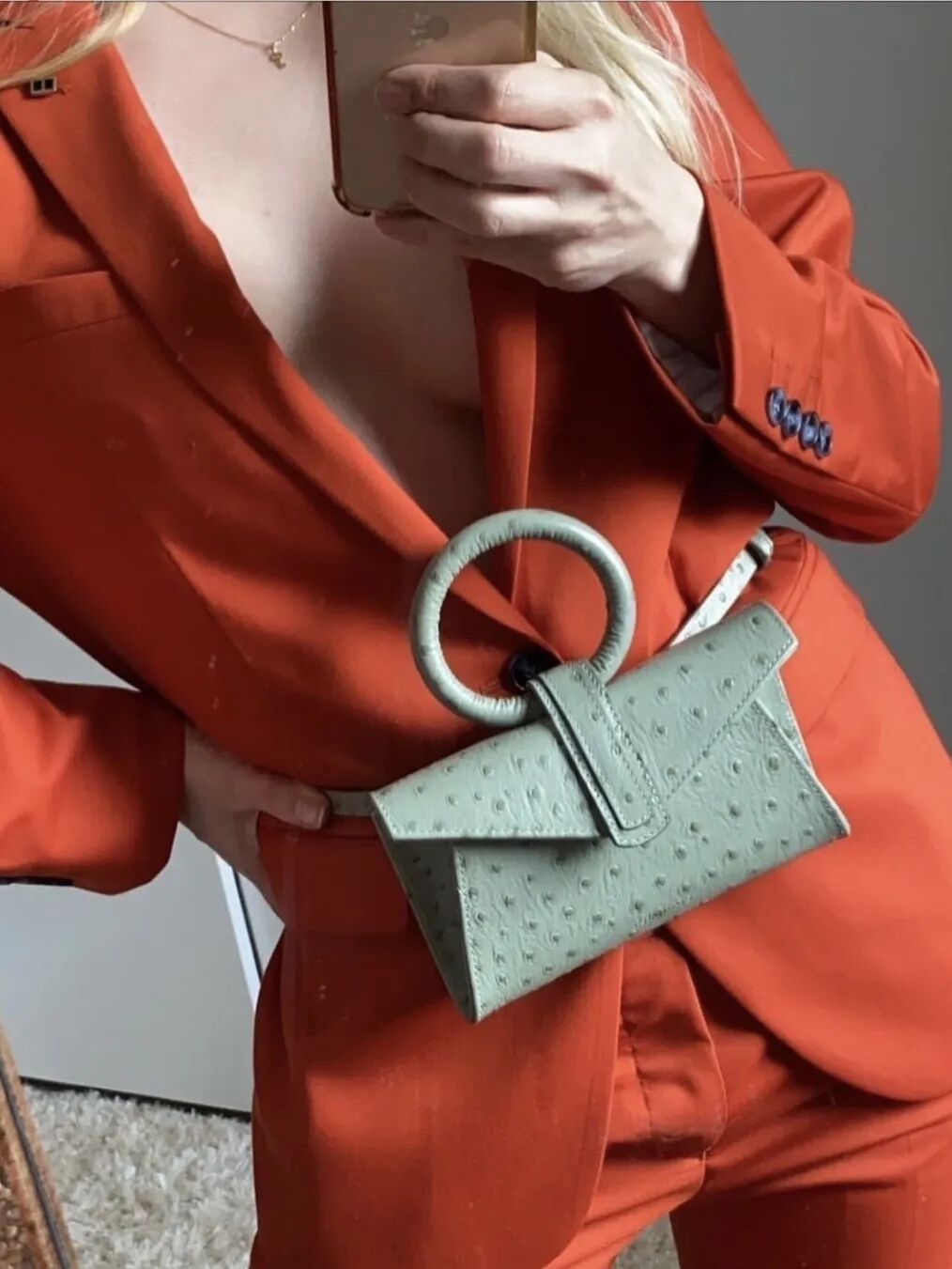 丹麦小众品牌Complét也毫不逊色,Mini尺寸的腰包加上圆环手柄瞬间就有了造型感,可手拎也可腰挎,最新系列的这款鸵鸟纹浮雕皮包质感非常独特,由意大利工匠用高品质皮革手工制造,马卡龙配色使这款腰间配饰包更玩味有趣。