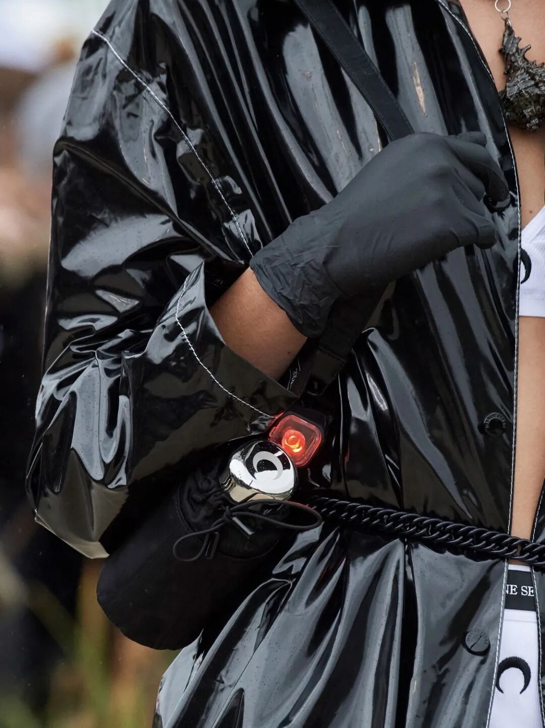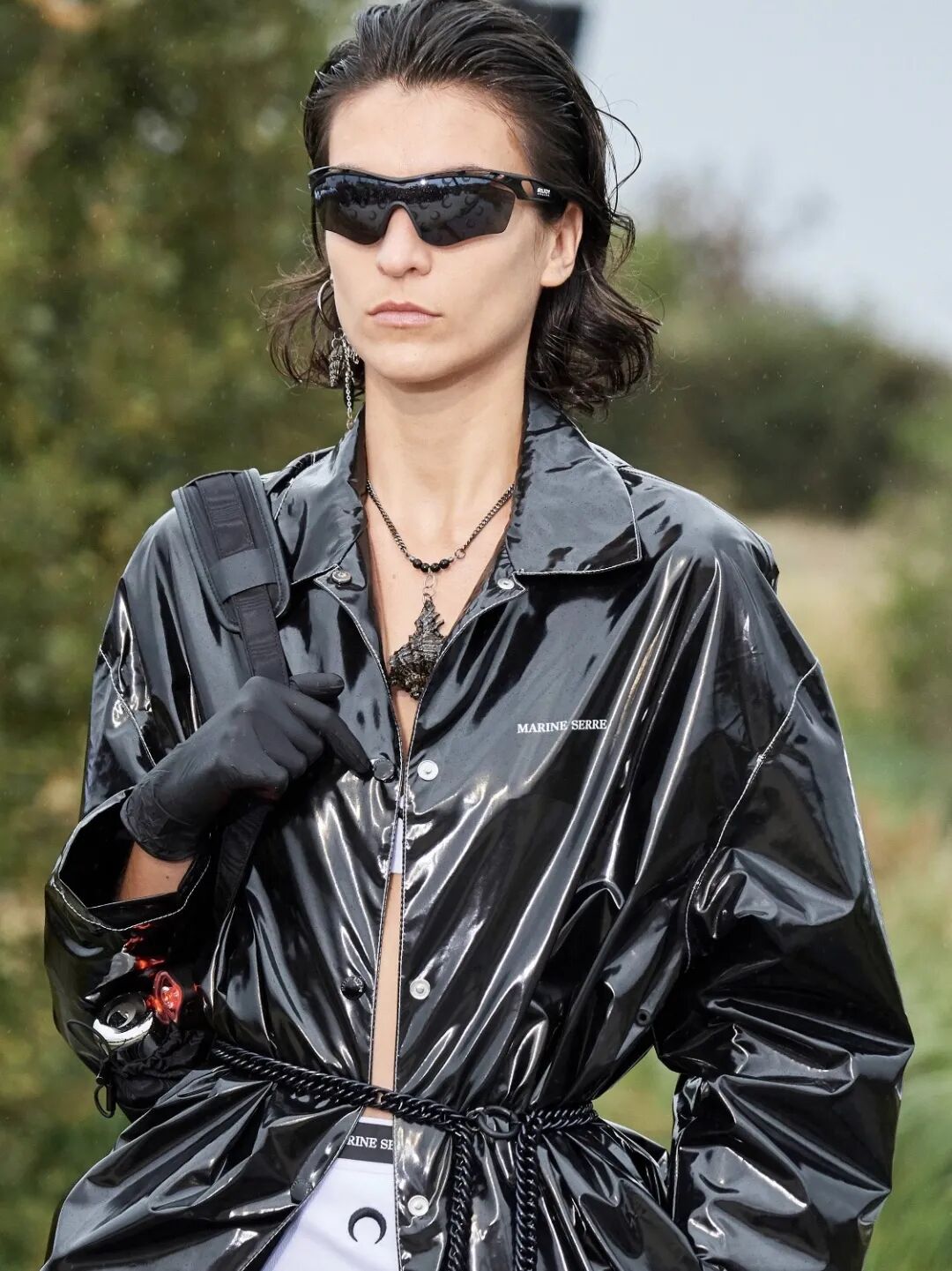 同样是水壶配饰包,Marine Serre则大打未来机能牌,暗黑链条也可以系在腰间,在廓形亮面风衣上自然勾勒出腰线。机能感的尼龙系口包诠释着实用主义,Marine Serre旨在打造未来新新人类,走这一挂的型男酷女们可以入手了。