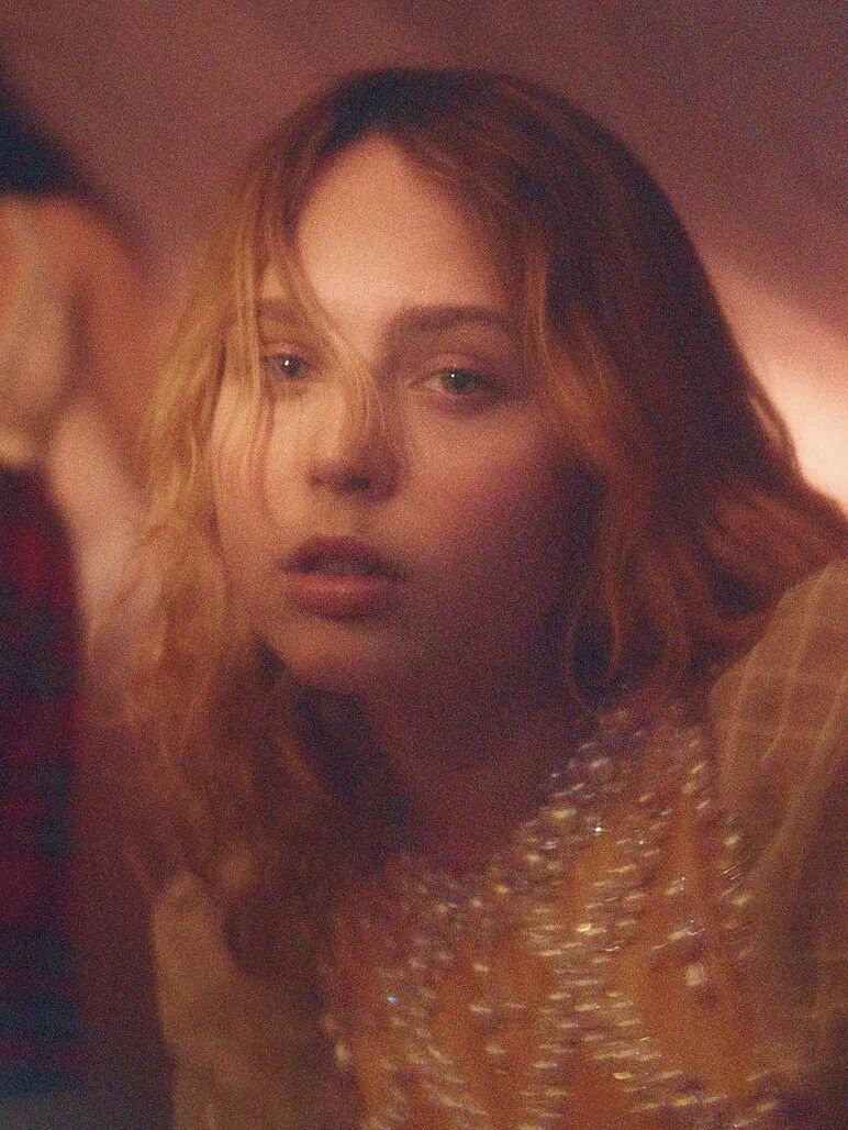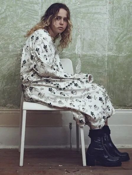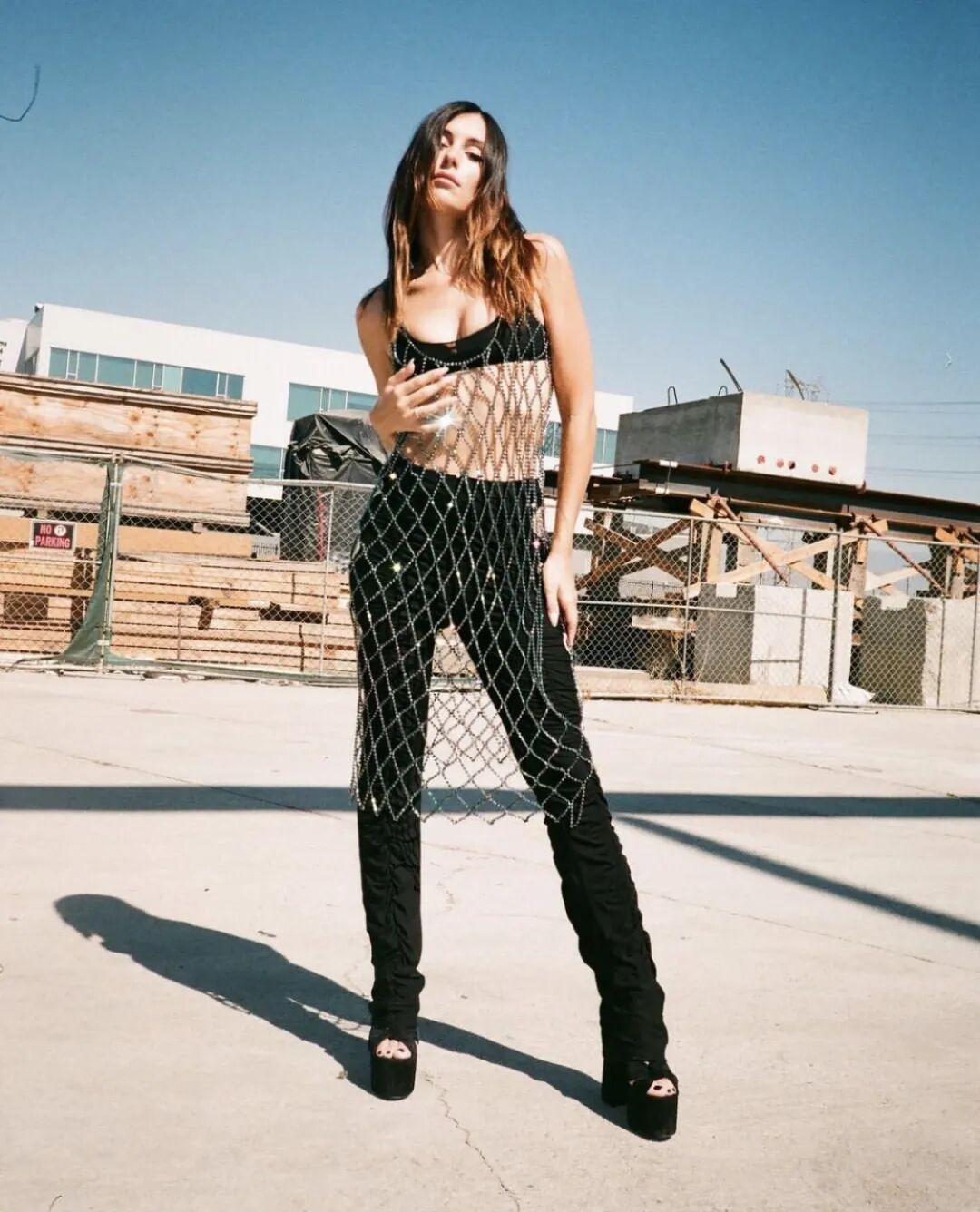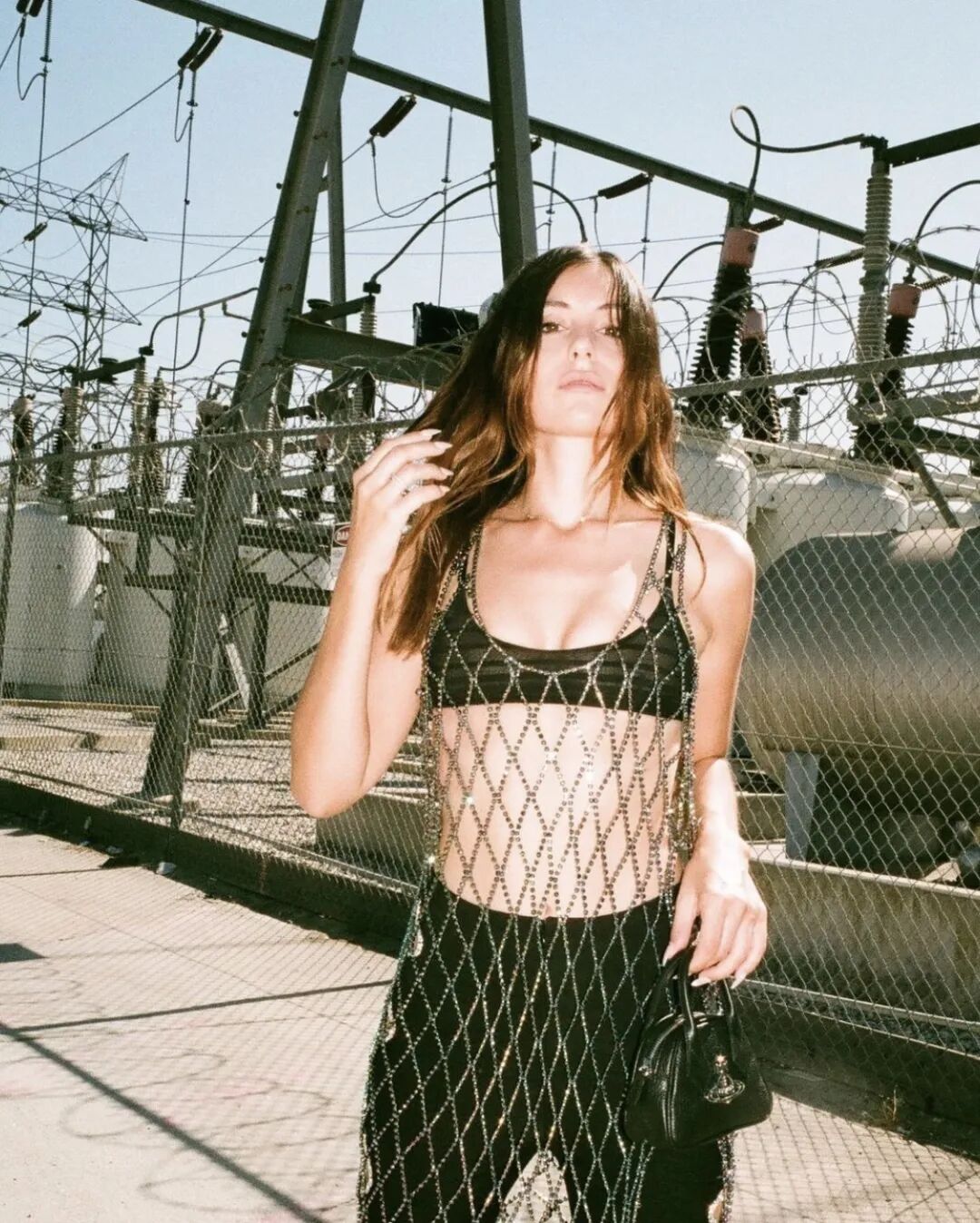 演员Marta Pozzan身上的这款也有异曲同工之妙,绝美的宝石渔网你见过吗?镂空设计降低了服装的量感,中和了宝石的华丽特质,很有灵动气息,和All Black搭配起来又酷又飒。