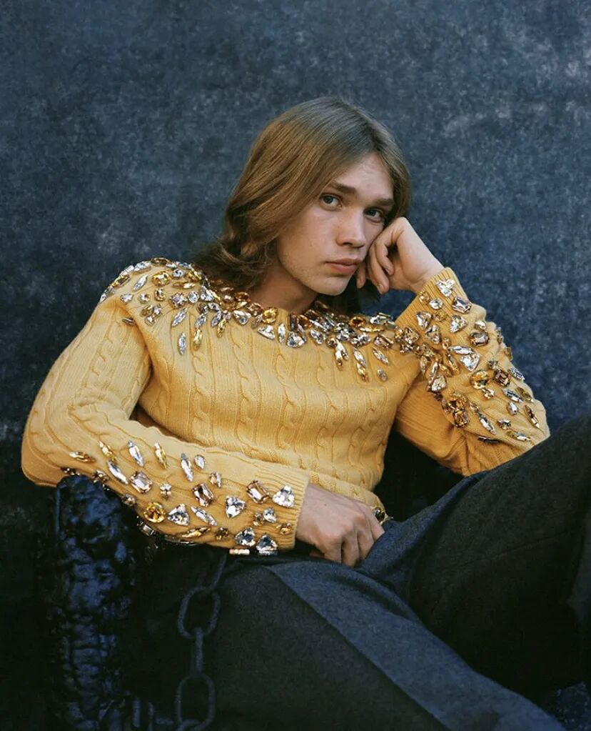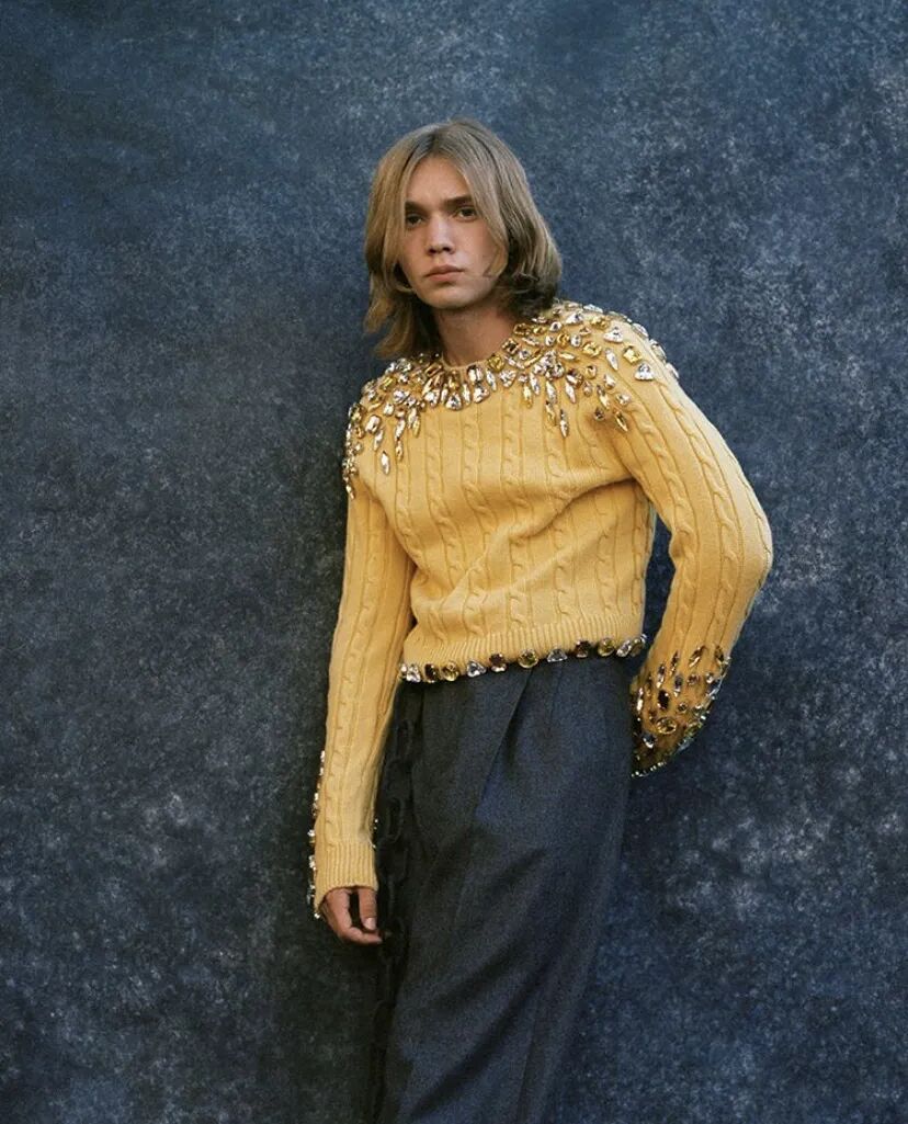 不少人都去求同款,于是芭姐也去网上翻了翻,发现今年LOEWE在服装上应用到水钻宝石元素的还真不少,大颗大颗的羽毛形状像披肩一样装饰在黄色麻花纹毛衣的肩膀、袖口和下摆处。