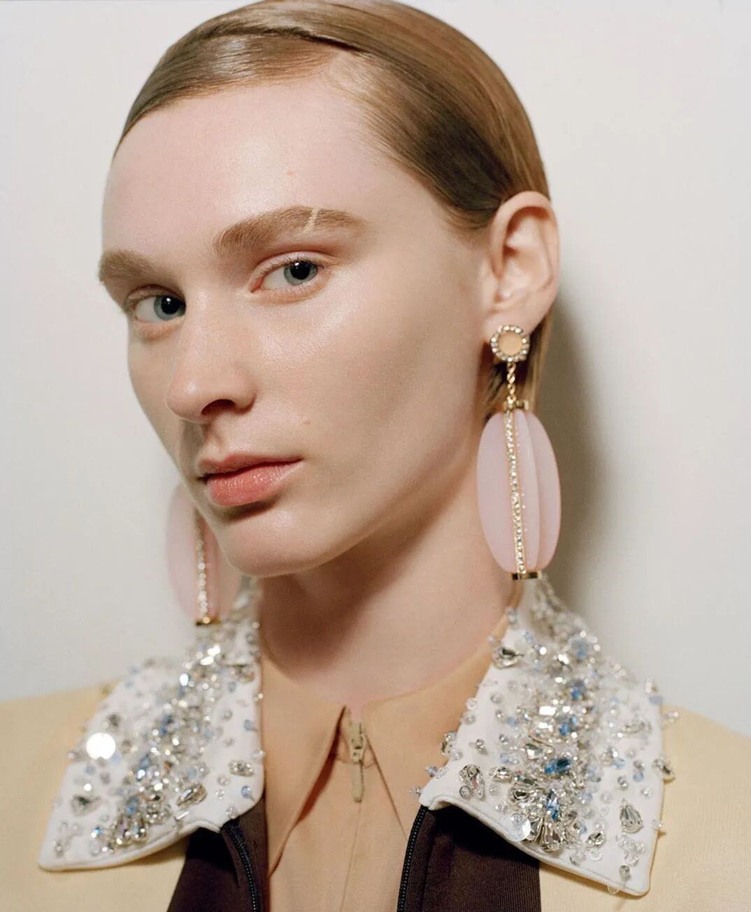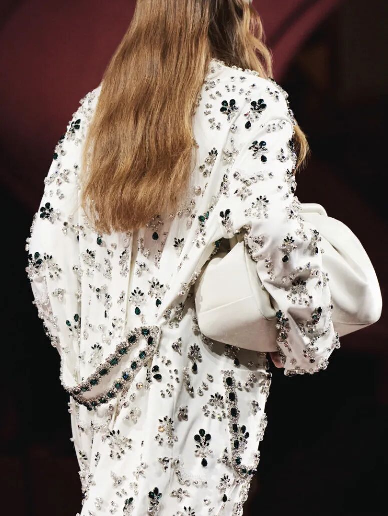 将宝石作为点缀也很可,绳绒织物和宝石的组合非常有质感,高耸的垫肩设计更是足够drama,适合不走寻常路的时髦精们!