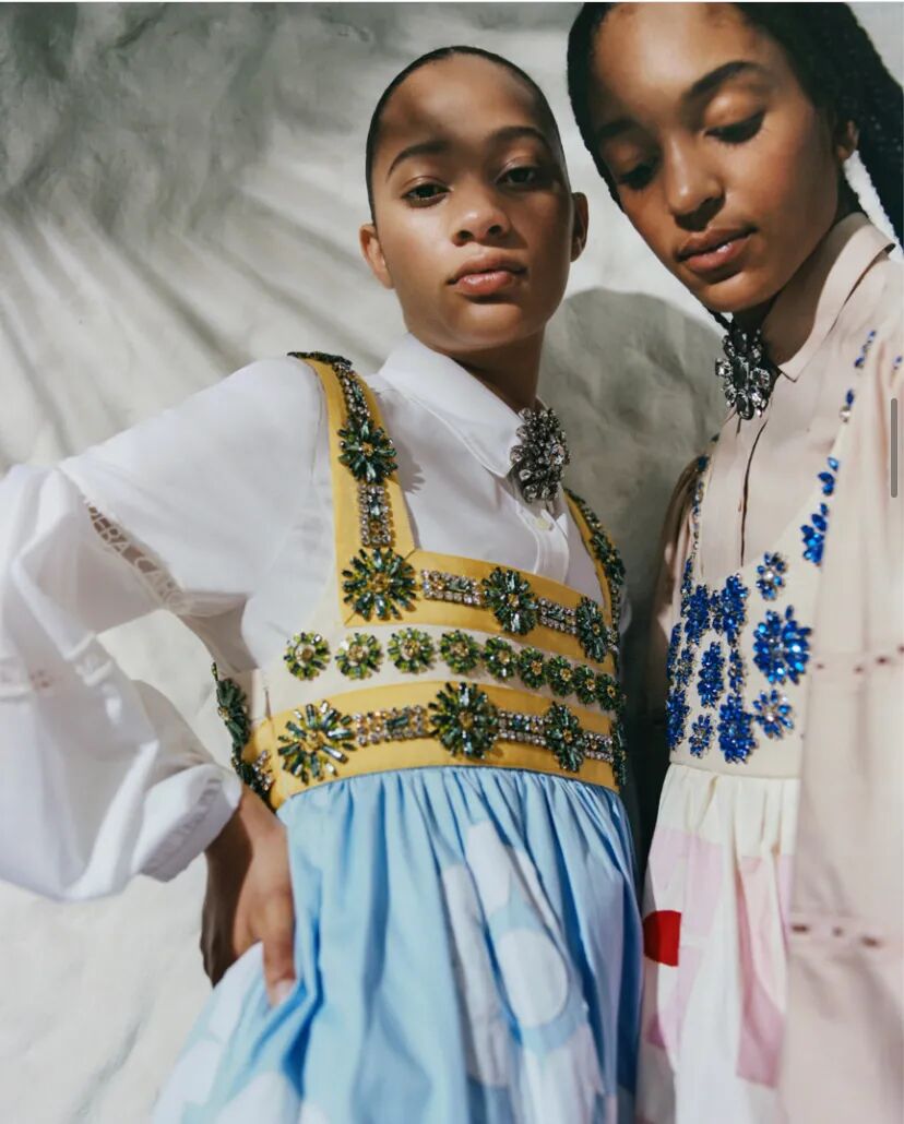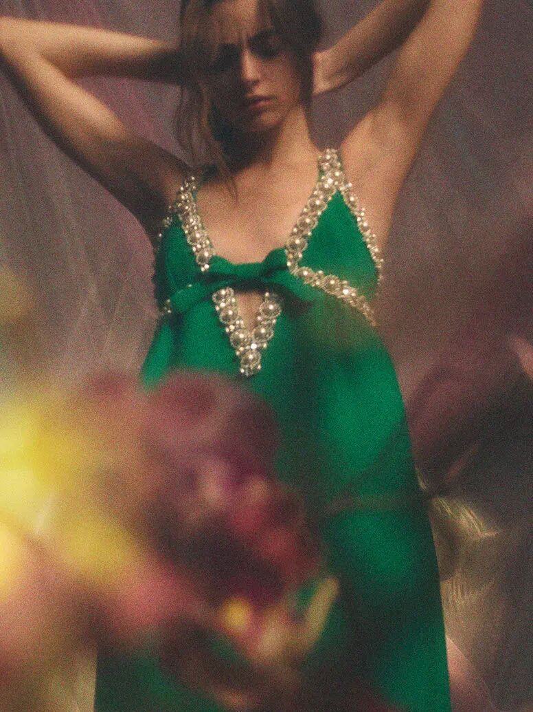 来不及等到明年春天的小伙伴们也别着急,实际上一直把水钻宝石元素发扬光大的Miu Miu,还有很多BlingBling的衣服可以立马就剁手,比如Miu Miu在2020春夏系列推出的吊带裙就让人眼前一亮,将宝石装饰应用在肩带与前胸上,充满童趣的裙装加上碎钻、宝石与米珠的碰撞,带着点俏皮的可爱感。