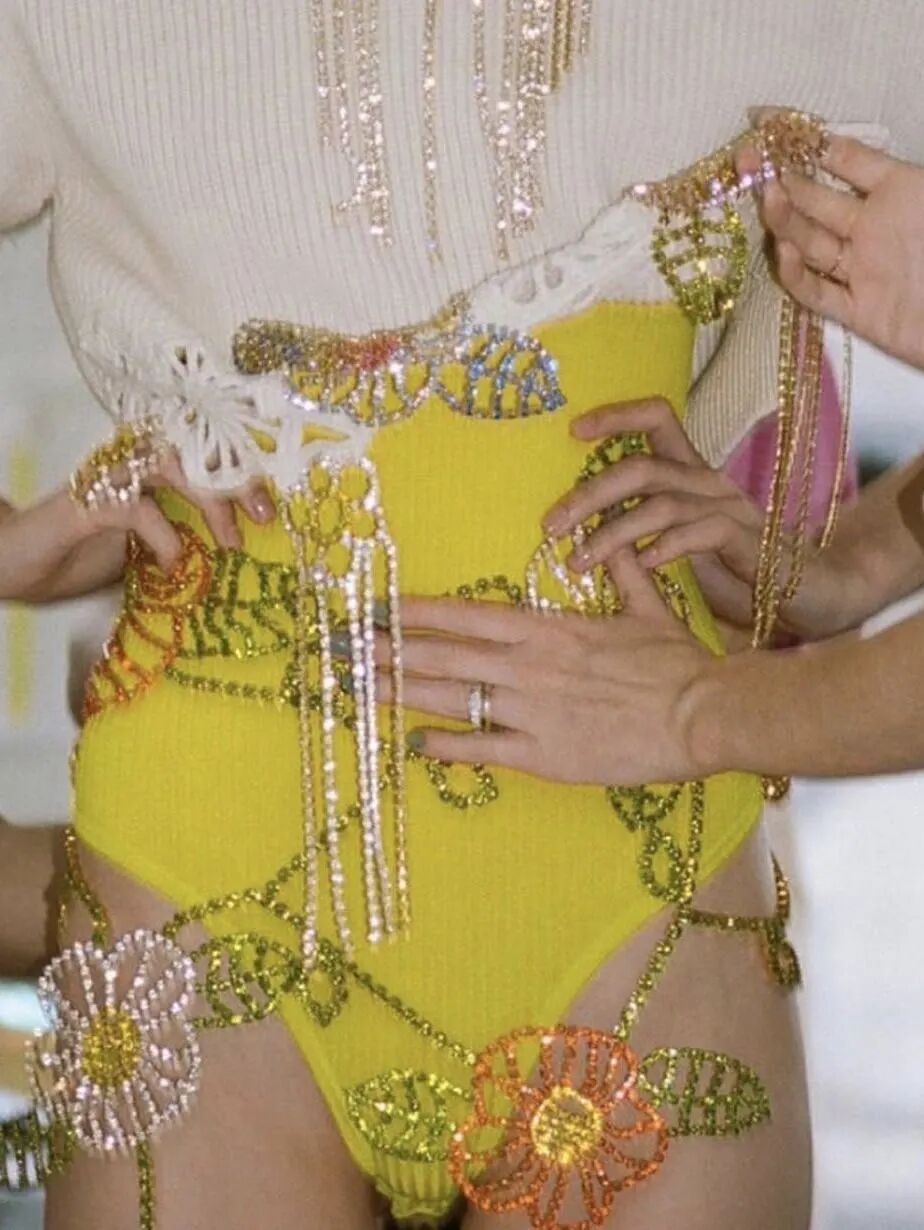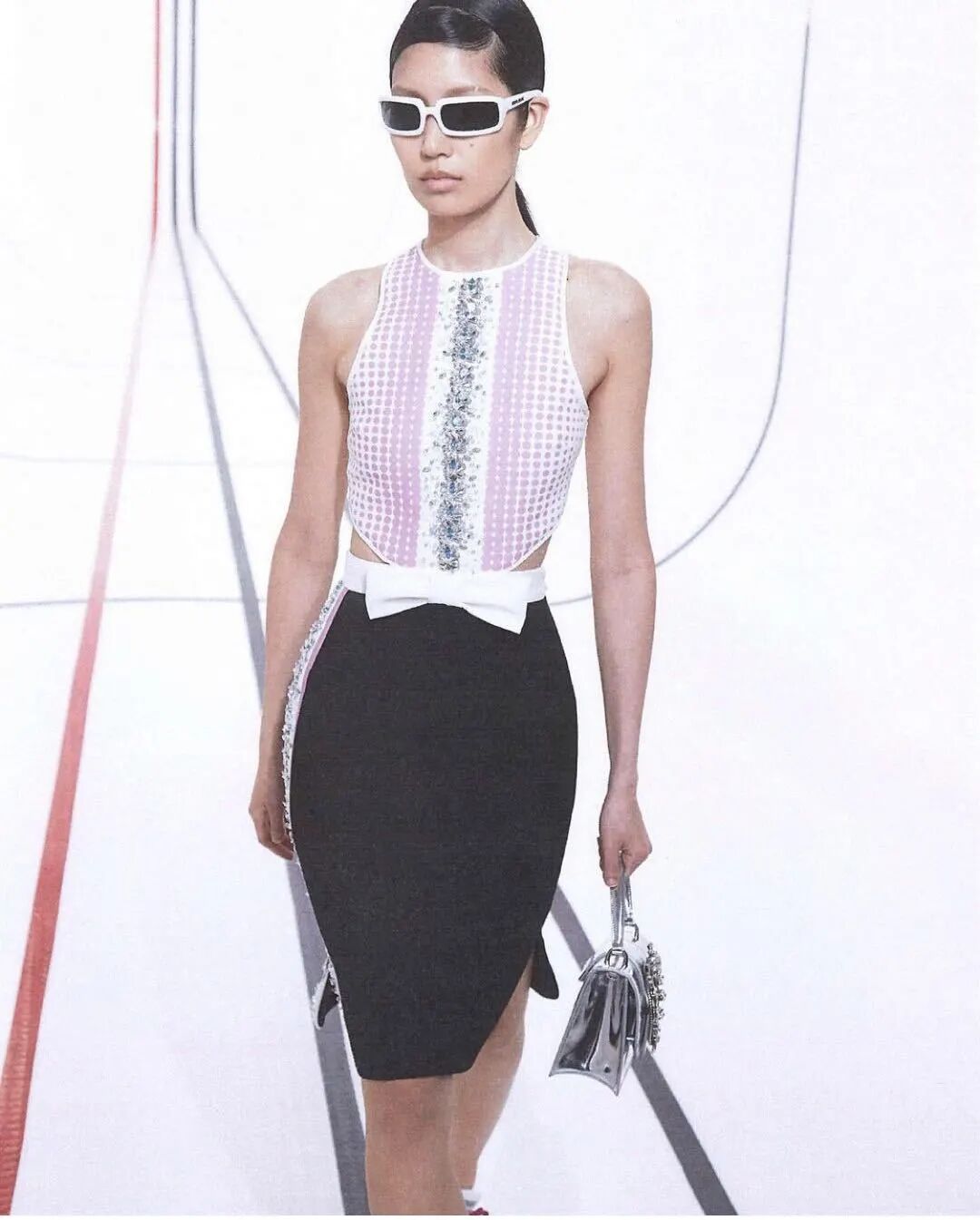 比如在2020秋冬系列中出现的这款水钻胸衣,就拥有它家典型的风格——华丽中带有一丝摩登意味,彩色的宝石组成了蝴蝶形状胸衣,用流光溢彩形容它绝对不过分!Lisa在新歌《Lovesick Girls》MV中就用它为造型加分不少!