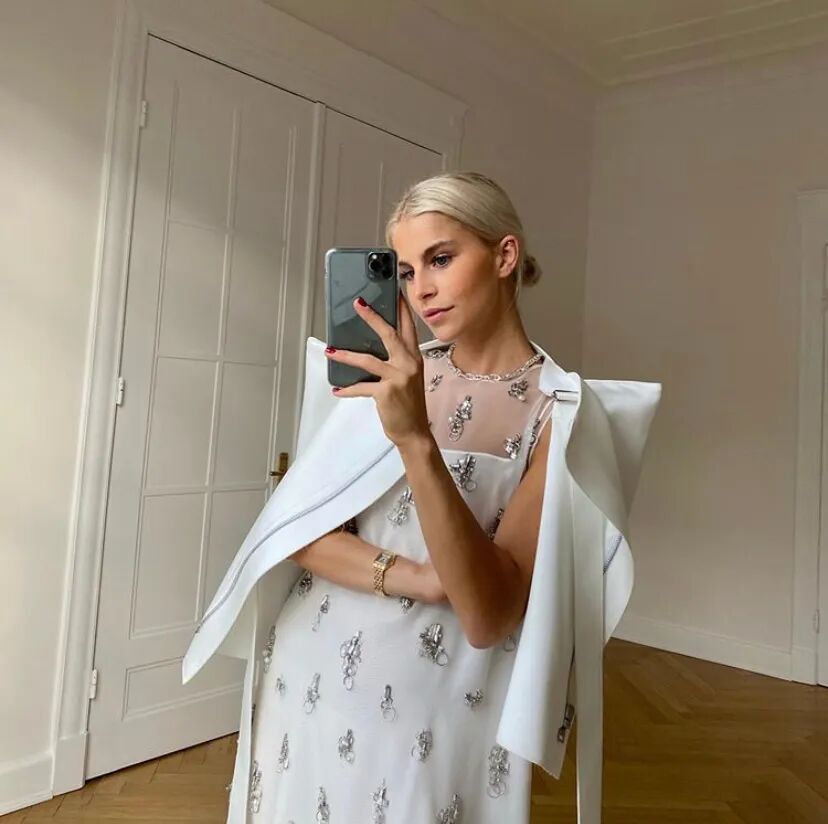 时装博主Caroline Daur则是拷贝了“同色系穿搭”公式,超美的水钻宝石裙装搭配版型特别颜色素净的外套,是绝不会出错的选择,优雅的气质都要从屏幕里溢出来了!
