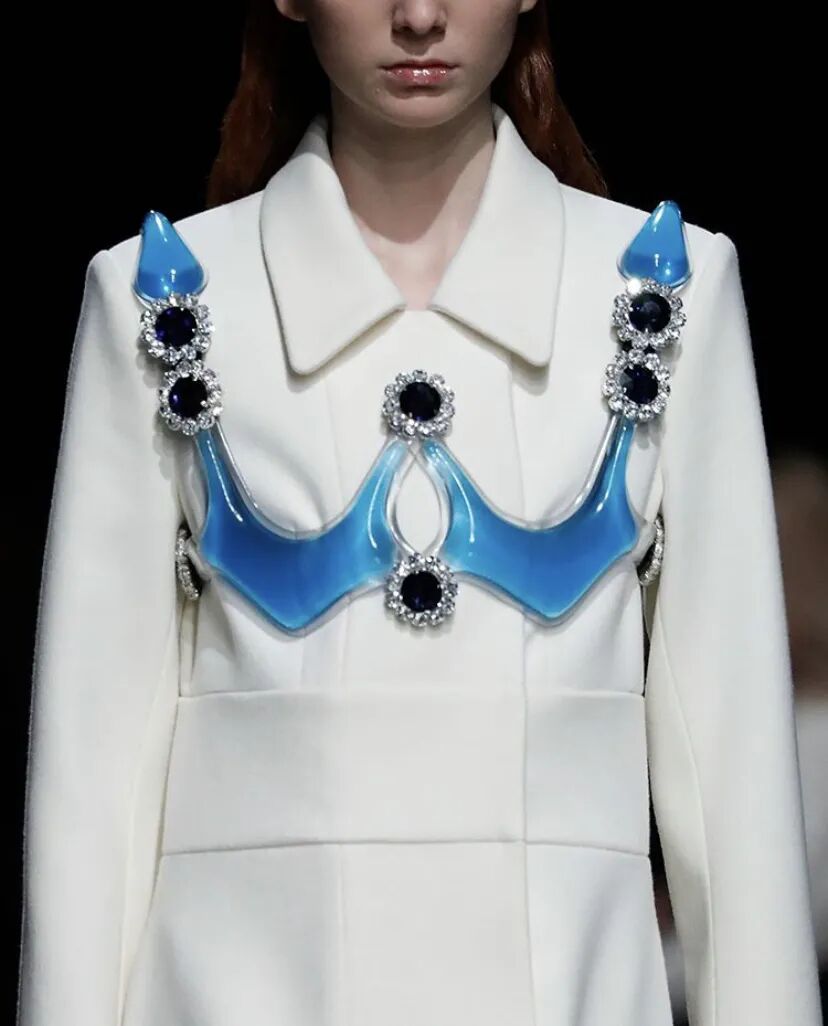 值得一提的是,它家推出的胸封配饰也很令人玩味,暗色宝石作为蓝色流动液体装饰的连接点缀整件白色大衣,注入的硅胶设计让时髦感和机能感并存,玩味十足!