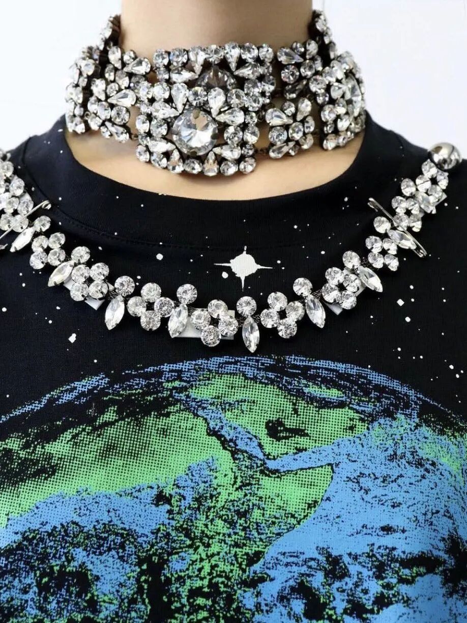 或者是在一件潮酷的T恤领口用华丽的白色水钻宝石进行装饰,像是直接戴了一个链条Choker,对于平时懒得搞搭配的人,真心忍不住想来一件!