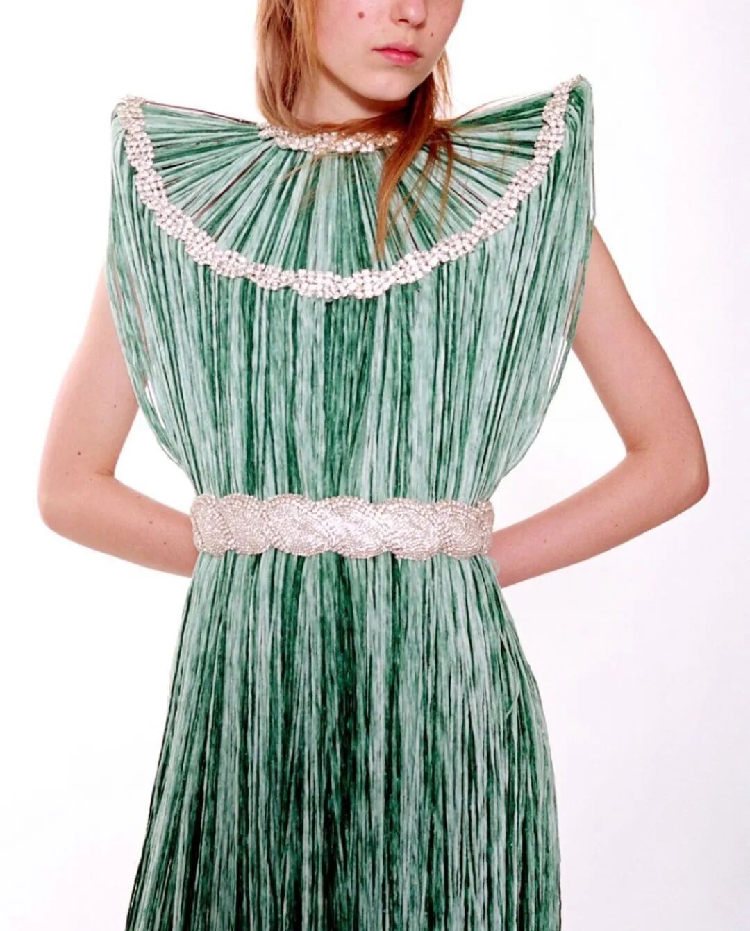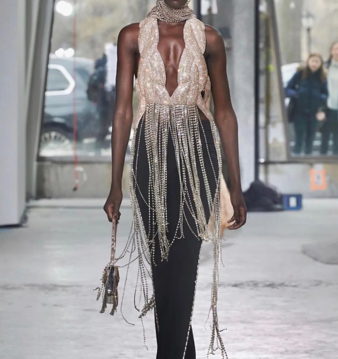 它家有几款礼服也绝对称得上重头戏,三角背心原来也可以和艺术品一样精致!编织样式的宝石背心已经足够闪耀,而长长的不规则宝石流苏更将视觉效果拉满,飘逸感立现。