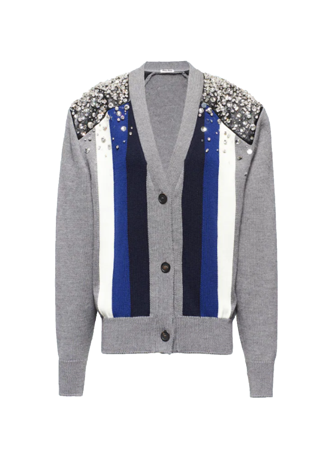 当然,Miu Miu也不会放弃为各位做好御寒准备,两种颜色可供选择的羊毛衫足够温暖,而雨落于肩一样的水钻宝石装饰足够华丽,皮革与针织面料的拼接是真的很酷哦!