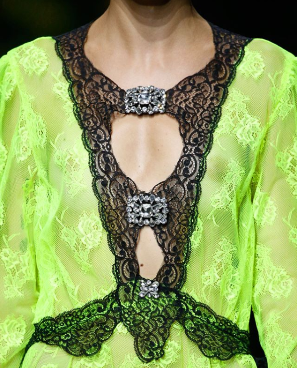 取代以往碎钻链条设计的是巴洛克风满满的大颗宝石,作为蕾丝上衣的领口衔接绝对是将优雅高贵淋漓尽致体现的绝佳方式!亮眼的荧光颜色反倒压制了过分的贵气,增添了不少弄潮儿的时尚感。