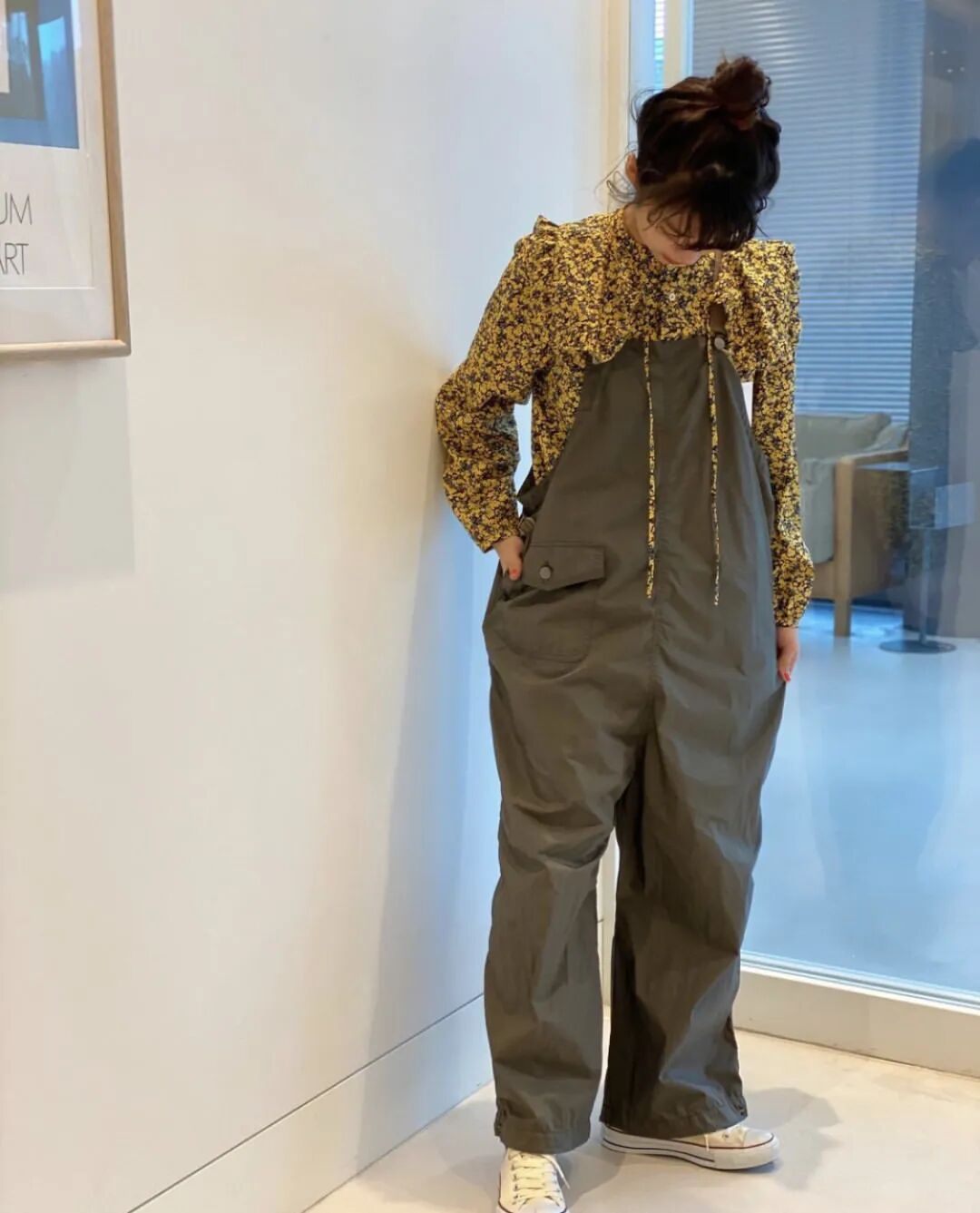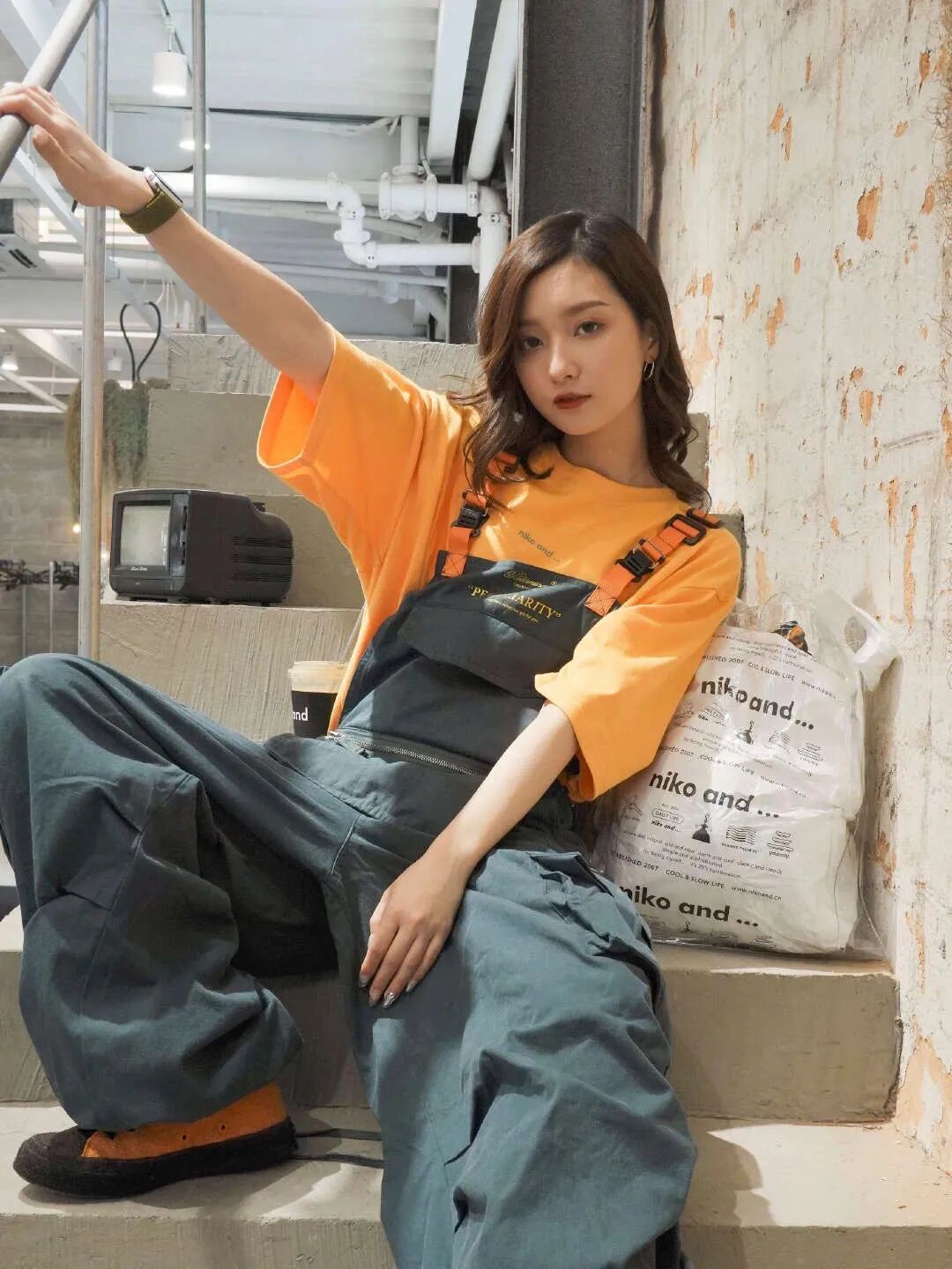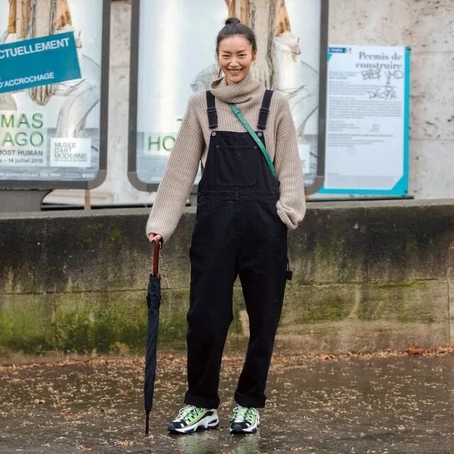 娇小的萌妹子们也不用害怕,只要将有收紧带的裤腿往上挽起来就行啦,露出纤细的脚踝部分,搭配一件彩色条纹或任意一件亮色上衣作为内搭,元气满满的少女感就出来了。尽管内搭的是一件轻薄质感如泡泡袖这样的单品竟然都毫无违和感,相反两种极大反差感的单品搭配在一起时,反而在少女感和中性风之间呈现出一种奇妙的平衡感。那么,同理可推如果搭配一件相近色系的小碎花上衣也不会感到奇怪了,再配上一双白色帆布鞋,第一次觉得中性风的背带裤竟然显得如此软萌可爱。