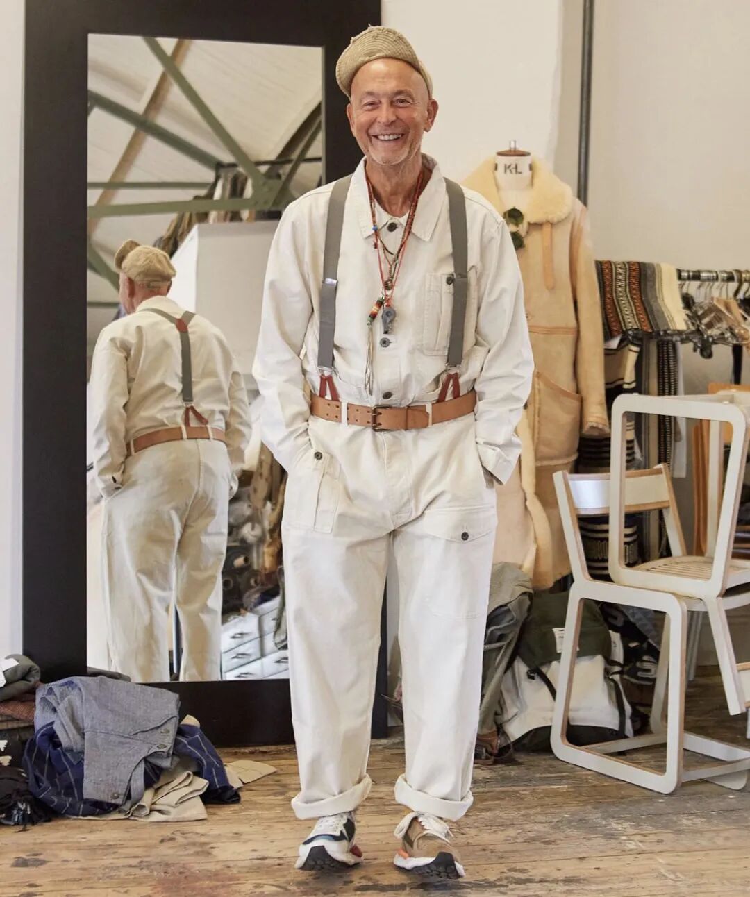平时经常关注时装周街拍和热衷古玩市场的小伙伴们应该对这位来自英国的怪爷爷感到很熟悉,经常穿着一件“脏兮兮”的工装背带裤,戴着一顶针织帽,脖子上还挂着一堆奇奇怪怪的配饰,总是露出憨憨的笑容。单看行头就能猜测应该不是一般人,没错,他就是那个被时装界称为“King of the hipsters”和“Duke of niesch”,并且在上世纪80年代就受到一票有名设计师认可的那个男人。年轻的时候通过贷款成立了自己的个人品牌,以扎实的面料和出色的设计在英国成立了两家店铺,日本五家店铺,就问你服不服,问就是连续39年都是盈利状态。虽然这是一个已经年岁不小的品牌,但也是近几年才火起来被更多的人关注到。其中Lybro是Nigel Cabourn品牌的主打系列之一,Lybro原本是一个于1927年诞生的英国最重要的传统服装品牌之一,后来于上世纪70年代倒闭关门,之后被Nigel Cabourn本人重新救活放入主打系列当中,再次为其赋予了新的生命力并延续至今。工装背带裤的设计灵感有很大一部分取用了各类工种的制服细节,所以在确保时尚度的同时还兼具着一定程度的实用性和功能性。