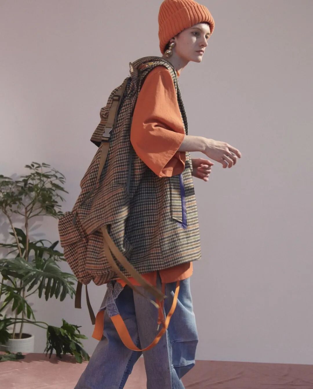 当然最关键的是品牌整体风格属于那种任意一件都是独一无二、特立独行的感觉,这件背带裤的款式设计就带有品牌标志性的交错复杂的结构设计特点,回收的面料质地又添加了一丝旧旧的复古味道。
