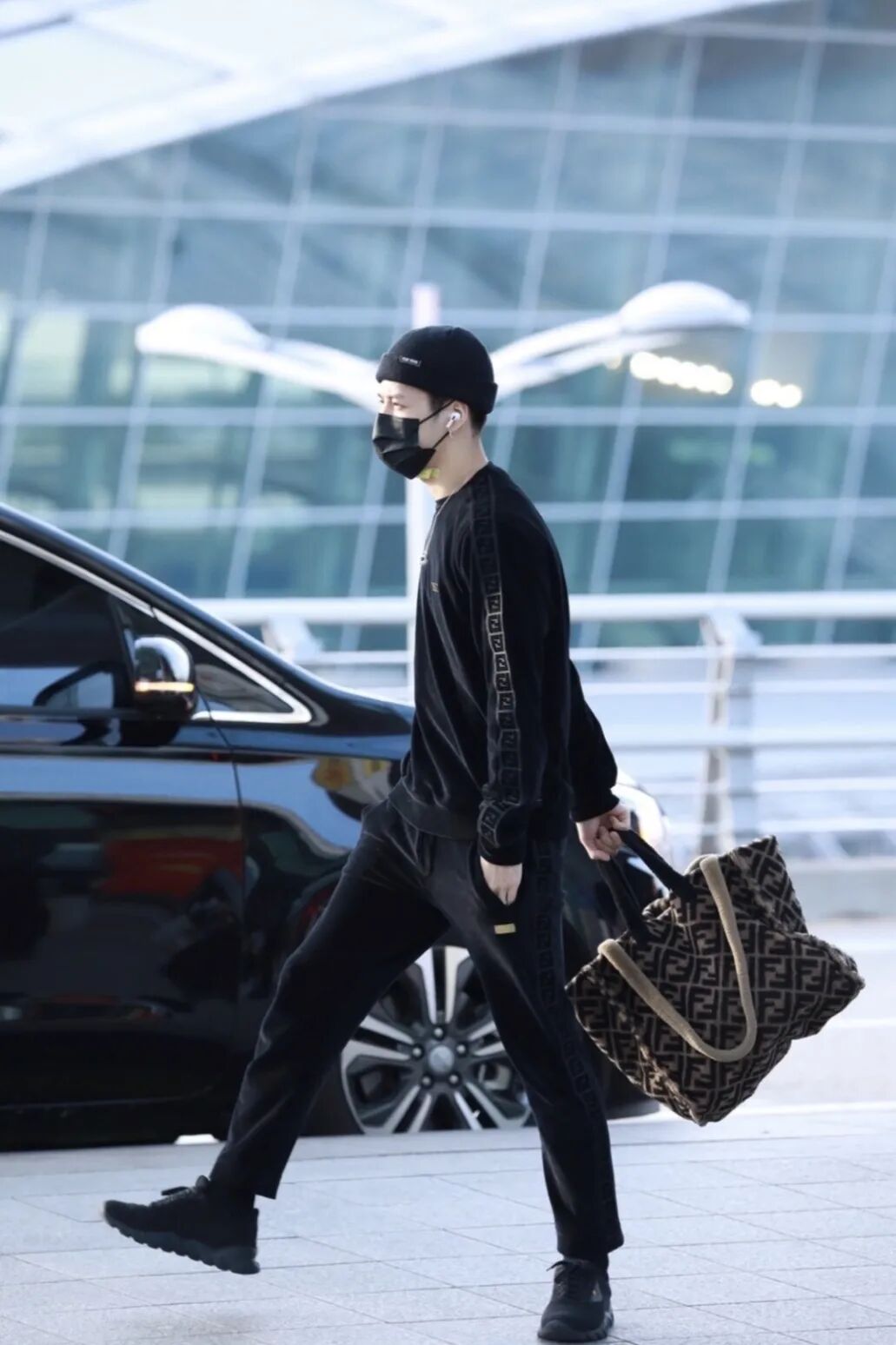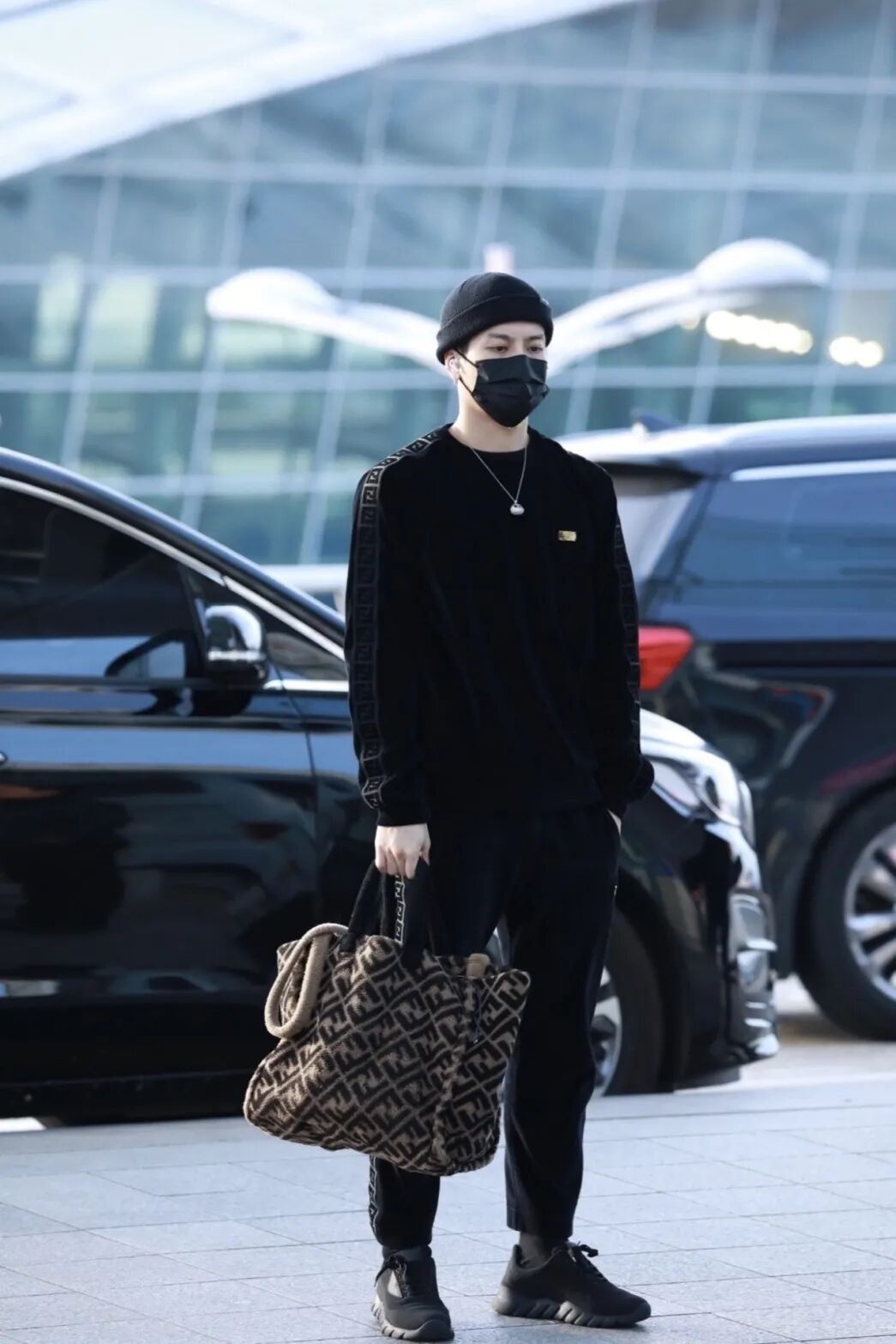 王嘉尔在机场Look中也出现了一款FENDI的老花毛绒手提包,点缀一身AllBlack,哥是要把机场变成秀场的节奏吧!