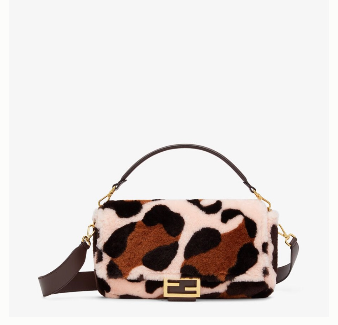 FENDI今年则是在印花方面下起功夫,要问起2020年什么动物纹元素最火,奶牛纹绝对要榜上有名,FENDI 2020秋冬系列直接将火爆的奶牛纹元素和毛绒质感相结合,大号的Baguette被戳到!