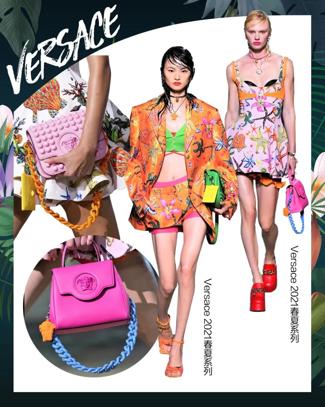 此次Versace 2021春夏系列带我们探秘水下的Versacepolis,这是一座沉没于海底已久的城市,是神话与未知世界相遇的地方。服装上,品牌标志性Trésor de la Mer印花描绘海洋生物,以鲜明的色调展示来自神秘海底古迹的灵感和活力。充满颠覆性的La Medusa手袋,包身Medusa头像装饰,俏皮的颜色,醒目大胆,活力十足。