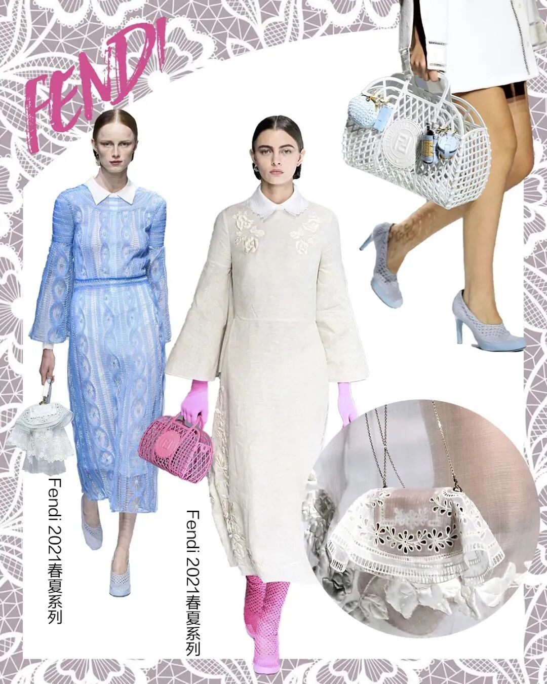 Fendi 2021春夏系列以“La Famiglia”(家庭)命名,灵感来自童年记忆和特殊时期与家人相处的点滴。Baguette手袋遇上Tombolo Aquilano蕾丝技术,轻盈的白色蕾丝随着模特的步伐随意摆动,仿佛随风起舞的纱帘,惬意自在,整个手袋瞬间轻松了起来。彩色的镂空手袋像不像妈妈的“菜篮子”?手袋上的可爱挂件仿佛带我们穿越到了童年,如此充满“生活”气息的Fendi,你爱了吗?