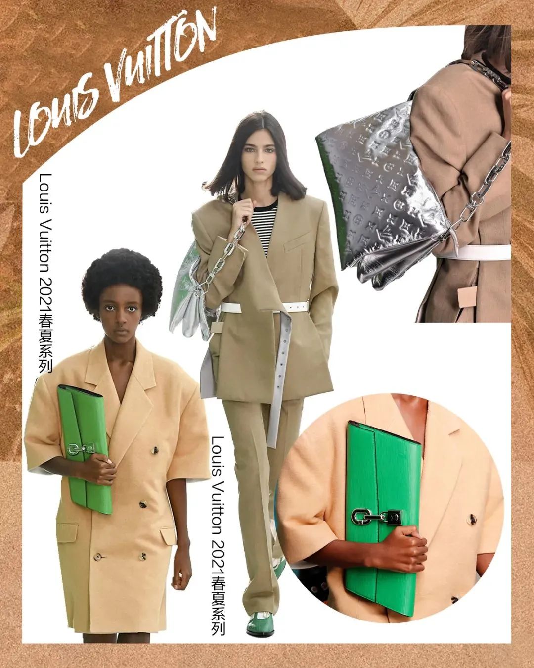 Louis Vuitton 2021春夏系列告诉我们,什么才是中性风。廓形、Oversize在这个系列中运用到了极致,营造出强大气场,包包也不例外。水银色包裹新季大手袋,搭配金属肩带,看起来很有力量感且充满了未来感,这是一款男女皆可驾驭的新包。绿色是本季最值得关注的颜色。造型前卫、风格大胆的绿色手包,简洁包身不做作,很有春夏的气息。怎么冬天还没到,我已经开始期待夏天了?