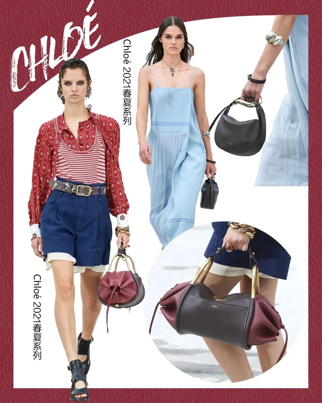 Chloé 2021春夏系列,上演了一场未来可期的故事,展现女性的无限可能。造型有趣且充满质感的手袋令人注目。首次亮相的Hailey手袋,以光滑小牛皮打造长枕形结构质感,两侧抽绳束带装饰摇曳,搭配磨砂金框架,极具辨识度。前卫的“Chloé之吻”图形金属遇到大热的Hobo手袋,大胆的碰撞,透露出Chloé GIirls的乐观精神。