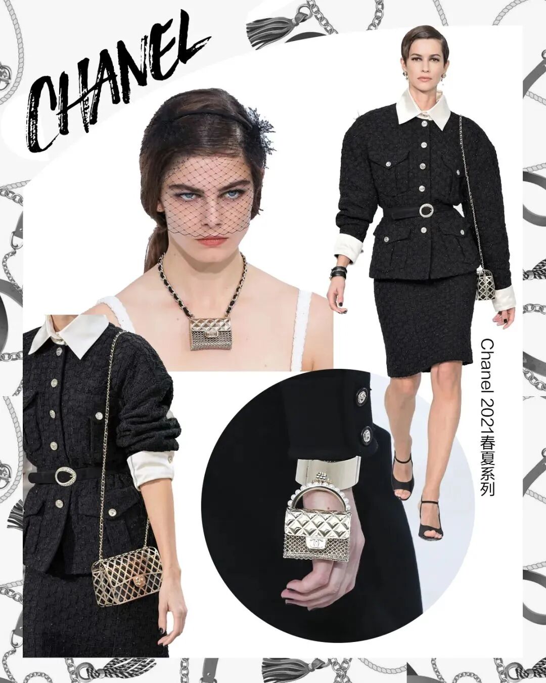 Chanel 2021春夏系列,创意总监Virginie Viard用缤纷色彩向品牌缪斯致敬,以电影般的情境诠释。服装上重现品牌经典的复古轮廓。值得关注的手袋方面,未来感十足的金属材质包包,镂空设计,犹如电影般充满视觉张力。超迷你的金属包包出现在手腕、颈间,这样的极致设计搭配金属材质包身,让Chanel多了一份叛逆与活力。