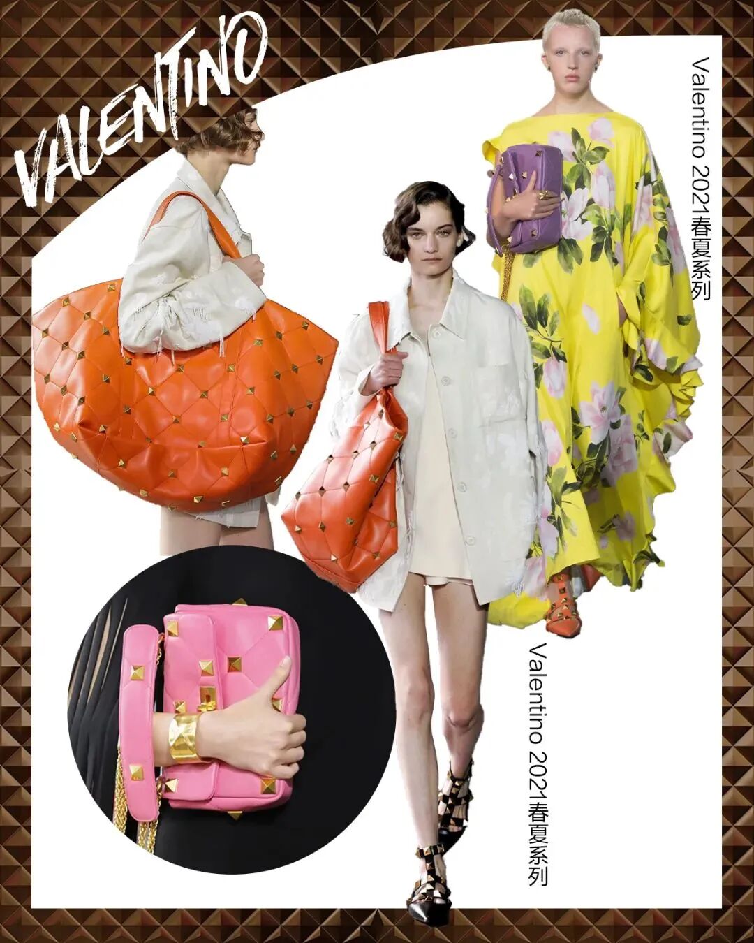 Valentino 2021春夏系列对浪漫的诠释不断升级创新,温柔薄纱裙搭配摇滚感的铆钉手袋,散发着女性亦柔亦刚的双面魅力。浪漫裙装上延续了Pierpaolo Piccioli最擅长的大廓形。包包方面,将品牌标志性的铆钉放大,包身颜色更加缤纷,视觉上很是抢眼。本季Valentino通过张弛有度的设计和搭配塑造出一个又一个飒、美兼具的独立女性形象。