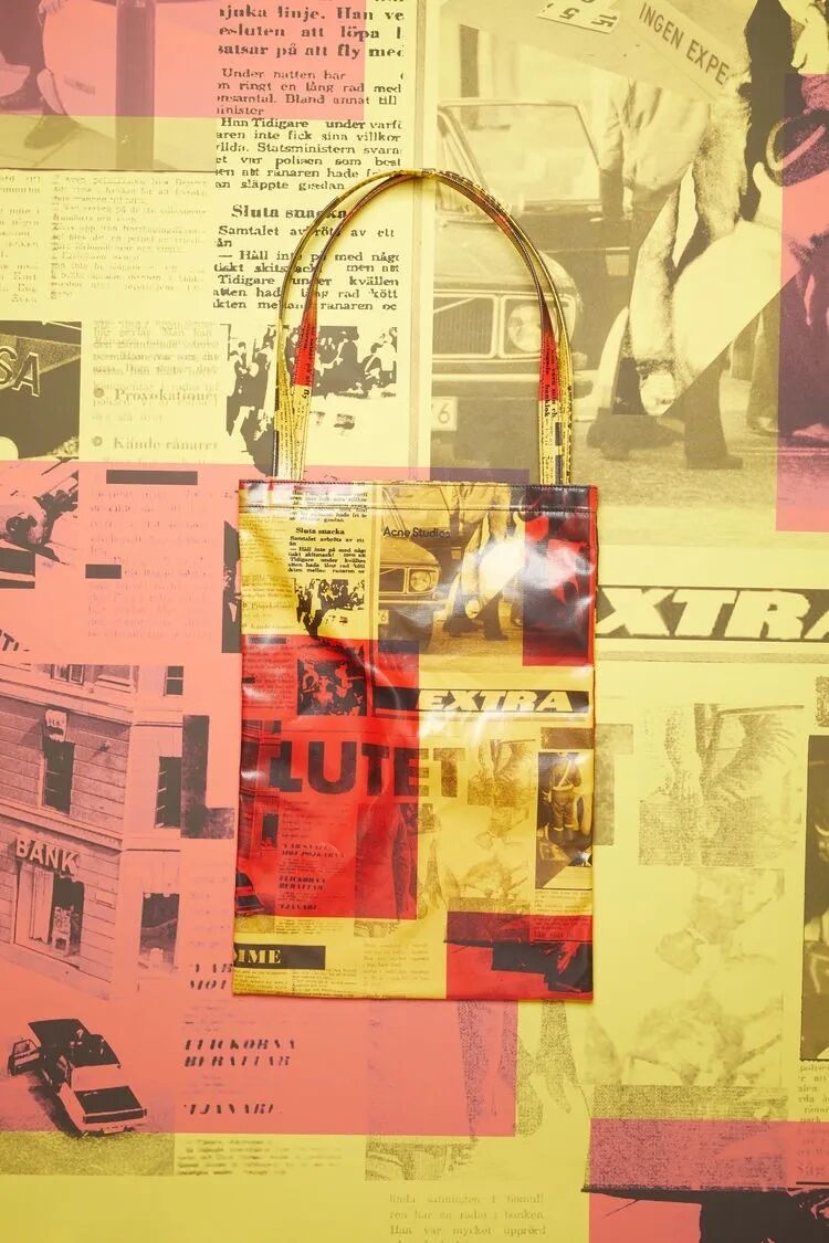 为了纪念Norrmalmstorg店铺开幕,Acne Studios还推出了斯德哥尔摩综合征胶囊系列,其中的油布TOTE BAG设计拼贴了当时关于犯罪事件电视报道的简报印刷图案,生动形象地把故事写进了包袋中,是值得收藏的一款。
