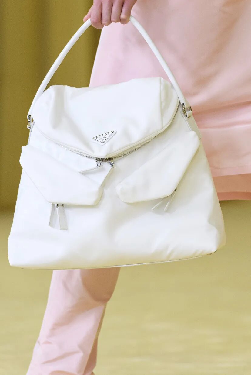 这款TOTE BAG特别采用了再生尼龙材质,精致的纯白色,形状有点像双肩包,运动元素与奢华造型的跨界牵手,这个意想不到的融合碰撞出了Prada的专属精彩。
