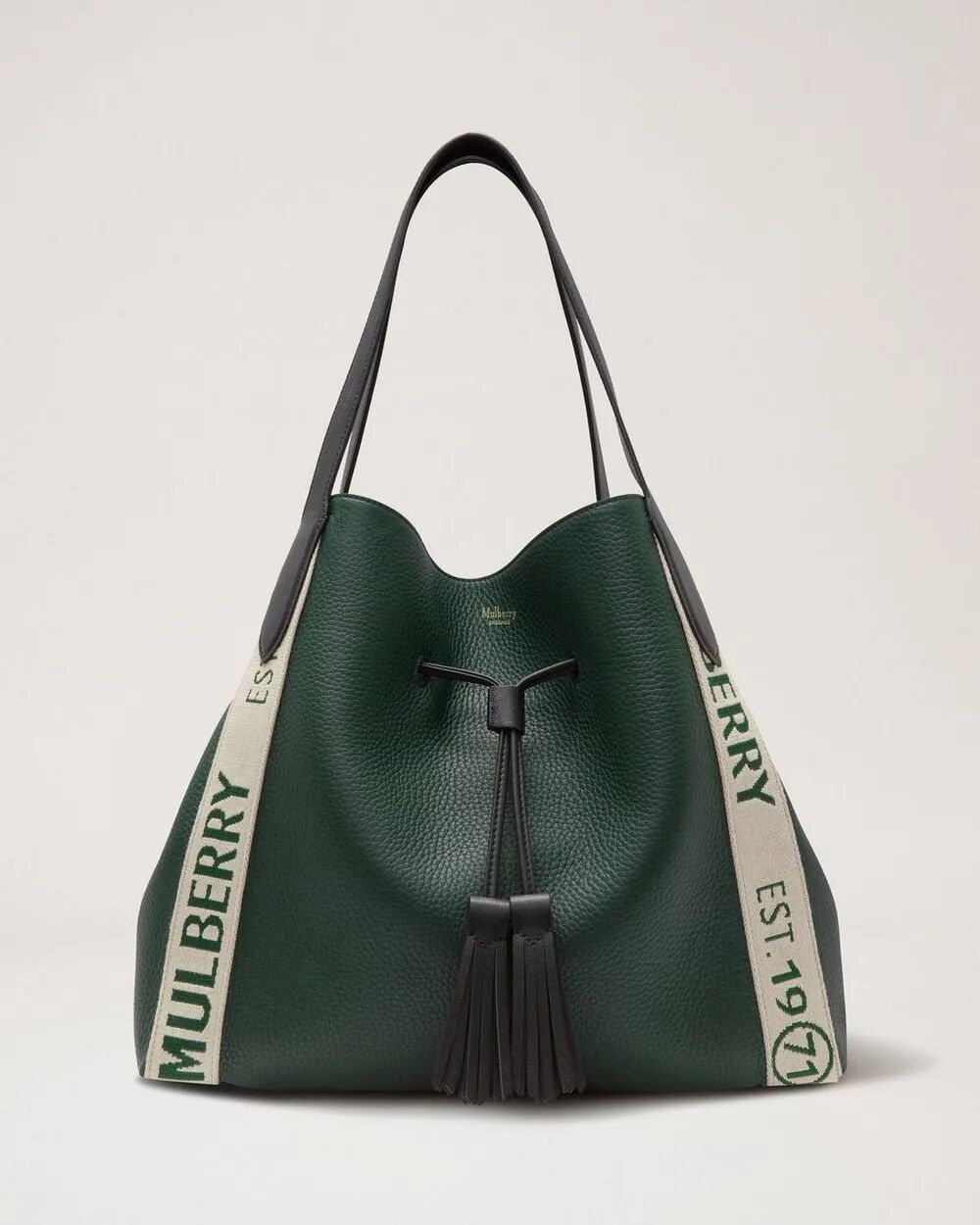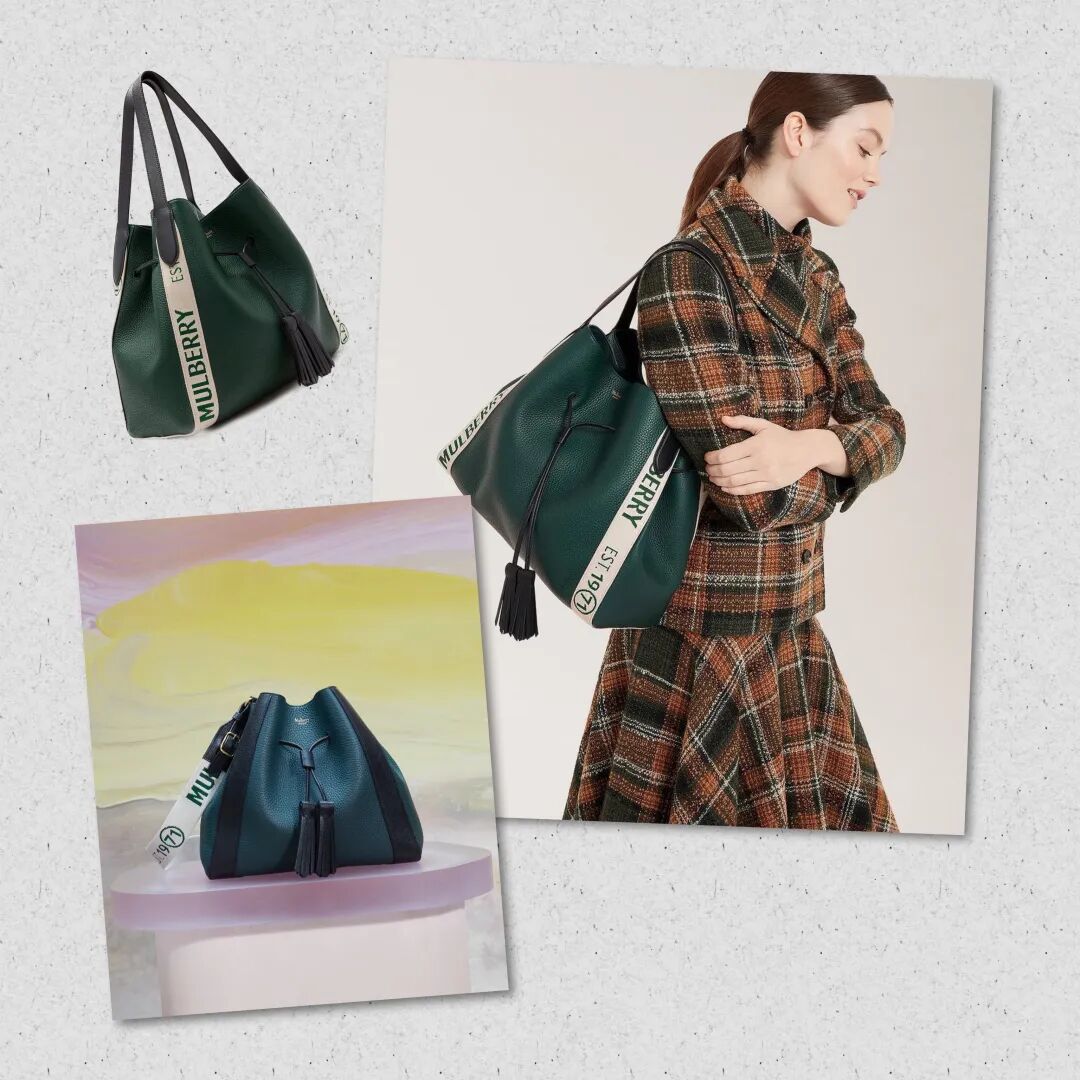 绿色爱好者的福音也来了,与橘色款不同的是,它加持了手带和两侧饰有“Mulberry Est 1971”品牌商标织带,配色设计挺别致,米色织带参与包包的面积不多也不少,点睛之笔,重度粒面皮革结实还高级。