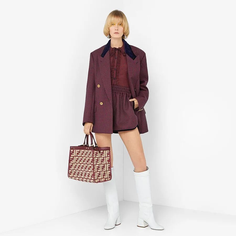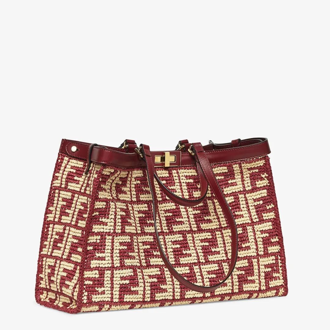 看了皮革材质后,不如换个口味,来看看FENDI这款拉菲草材质的Peekaboo X-tote手袋,高级的酒红色配米色FF图案,重现品牌经典扭锁做点缀,很有味道。