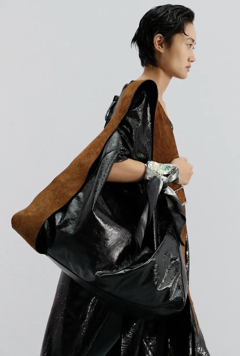 在最新发布的2021春夏系列中,Acne Studios TOTE BAG以颠覆夸张的形象在秀场上亮相,闪亮的光泽、金属感的材质柔软和谐,特立独行是它的关键词。