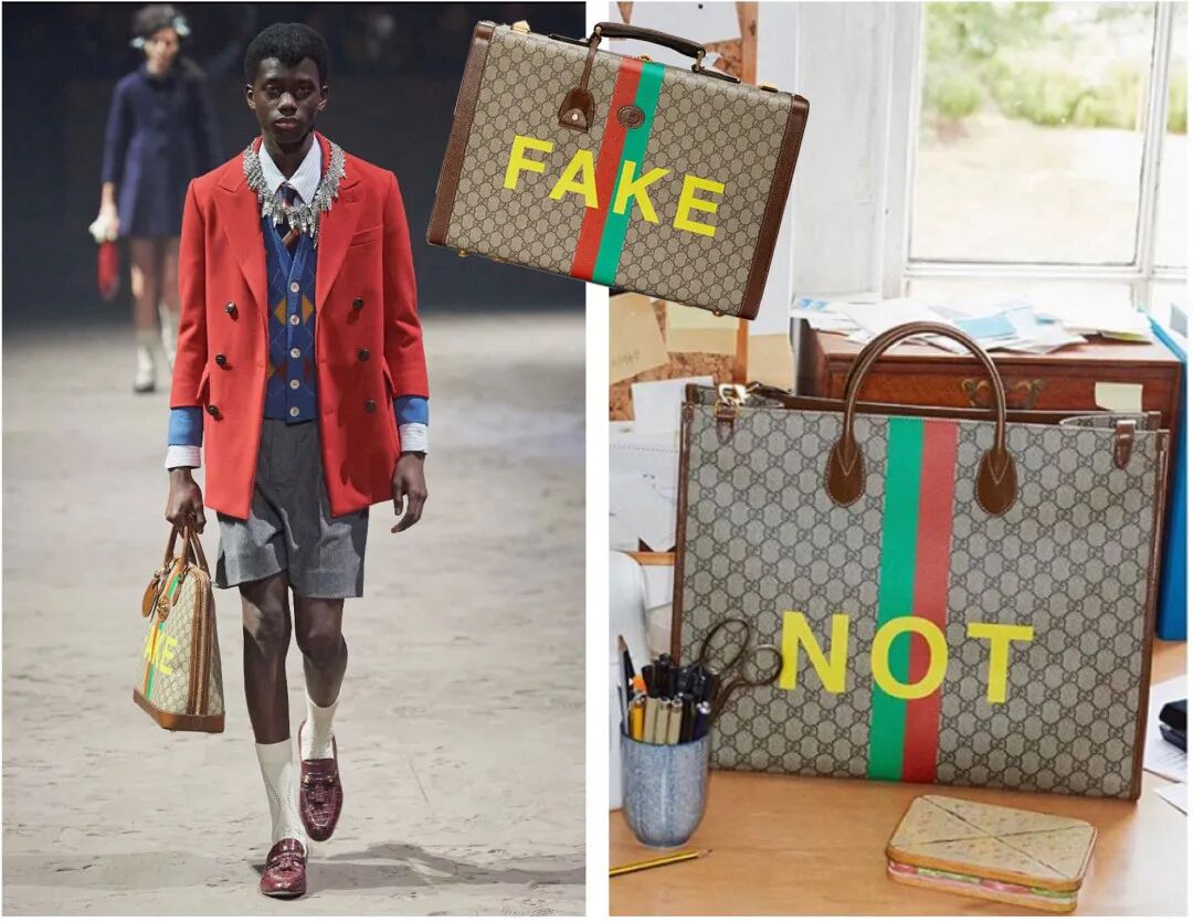 “GUCCI FAKE NOT”全新系列的灵感来自于20世纪80年代初的流行标识并逐渐成为街头潮流的时尚语言,在经典款TOTE BAG的基础上加入了诙谐幽默的恶搞单词,辨识度极强。