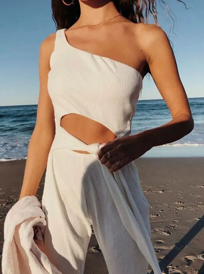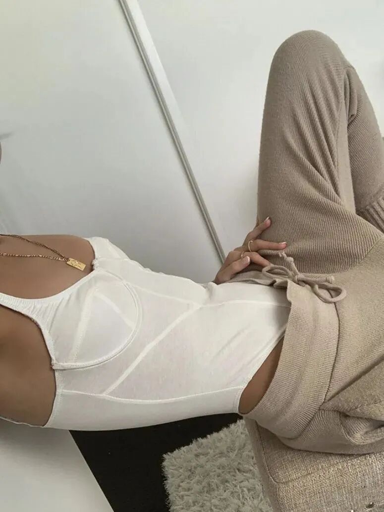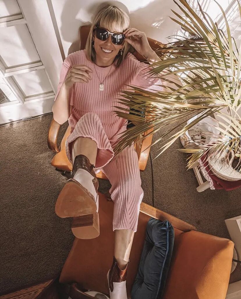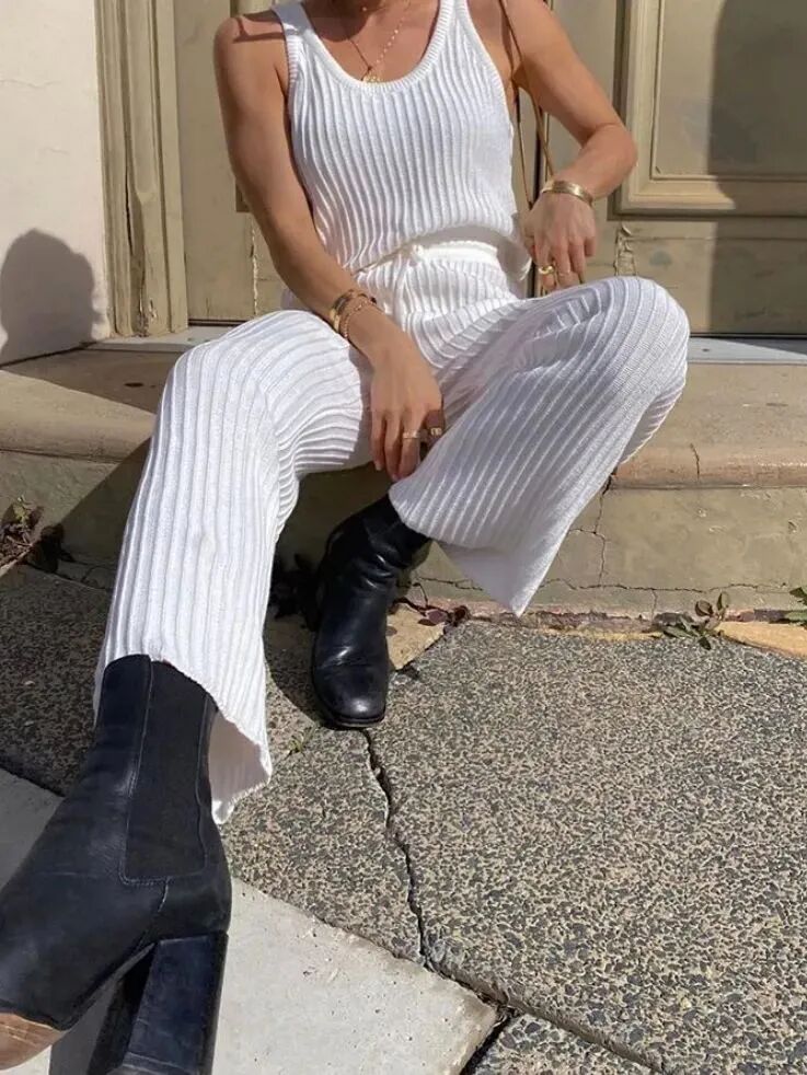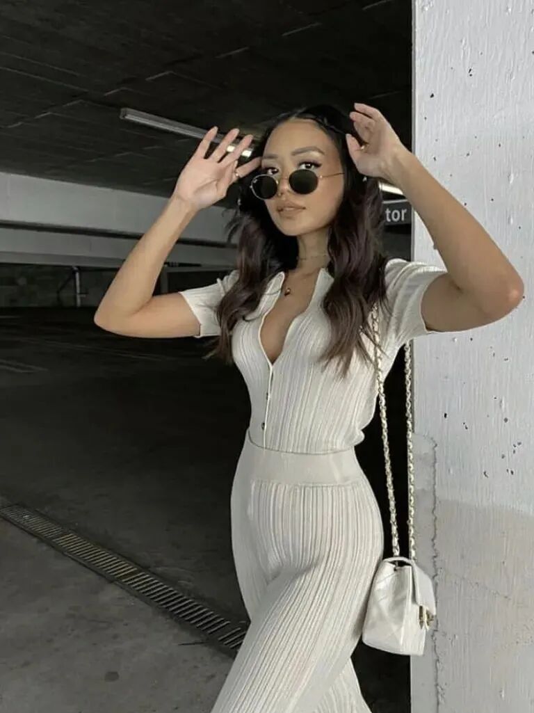 Isabelle Mathers身穿的这件针织连身裤光是看着时髦程度就在直线飙升,适当的挖空设计与针织绑带相互交错,高腰长裤也能完美拉长腿部线条!