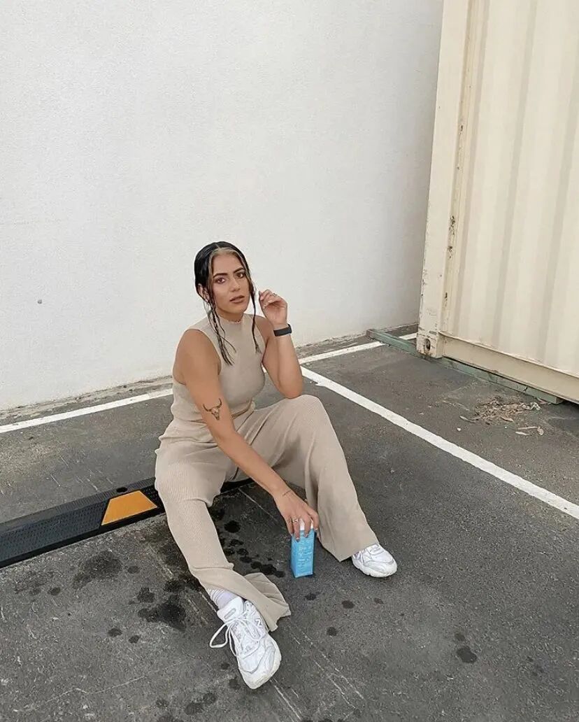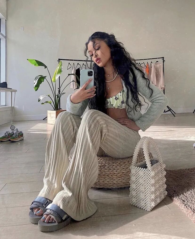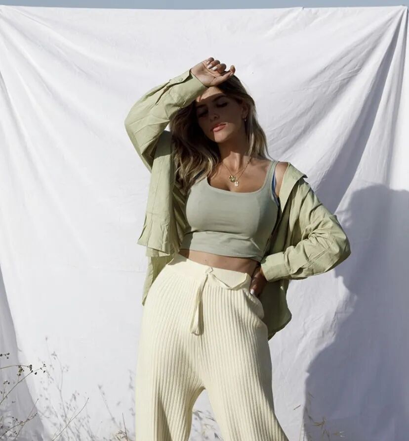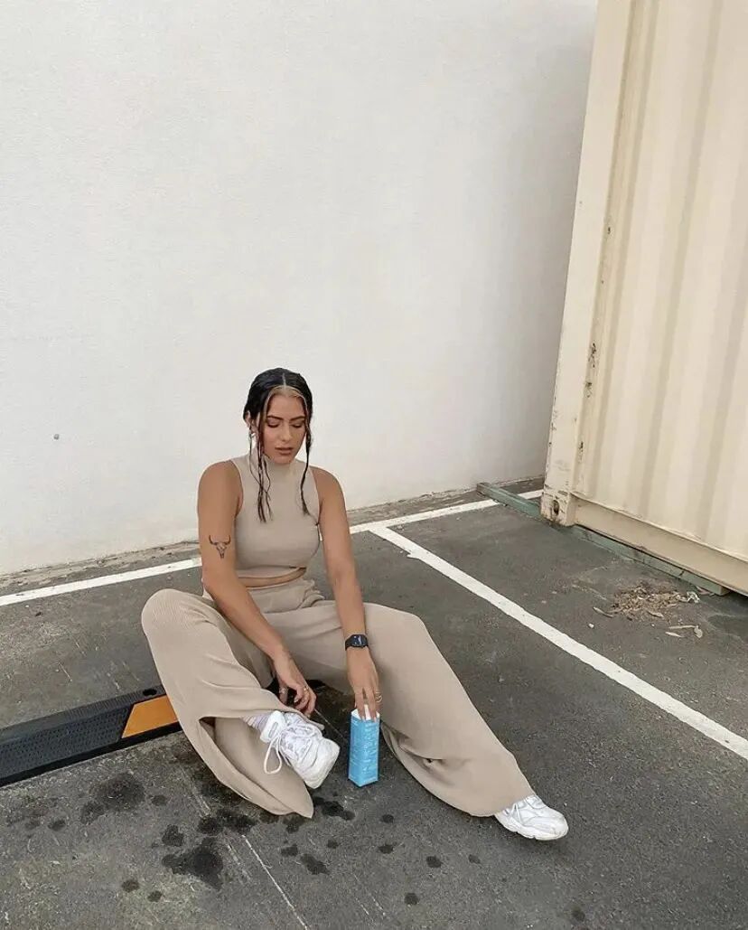 时装博主Desiree则是用一条平纹系带的宽松针织裤搭配运动背心和衬衫,加上大帽檐的遮阳帽,表现力也是十分出色了!