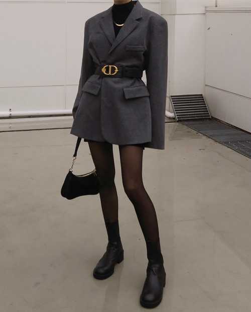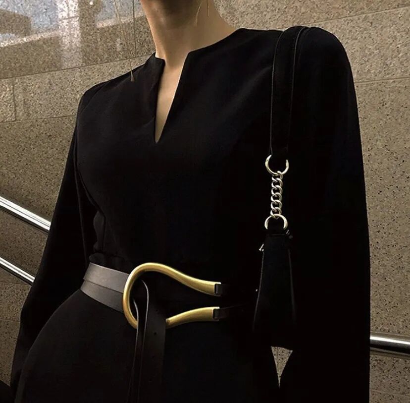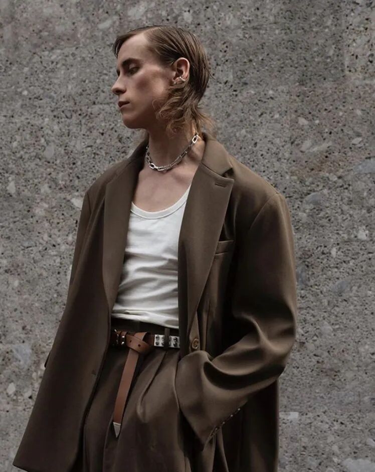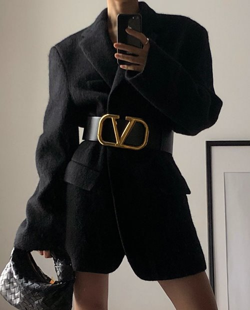 比如设计师喜欢穿西装的时候在腰间别上金属皮带收腰增加亮点,用最简单的服装配饰搭出高级风格,让All Black不显单调。